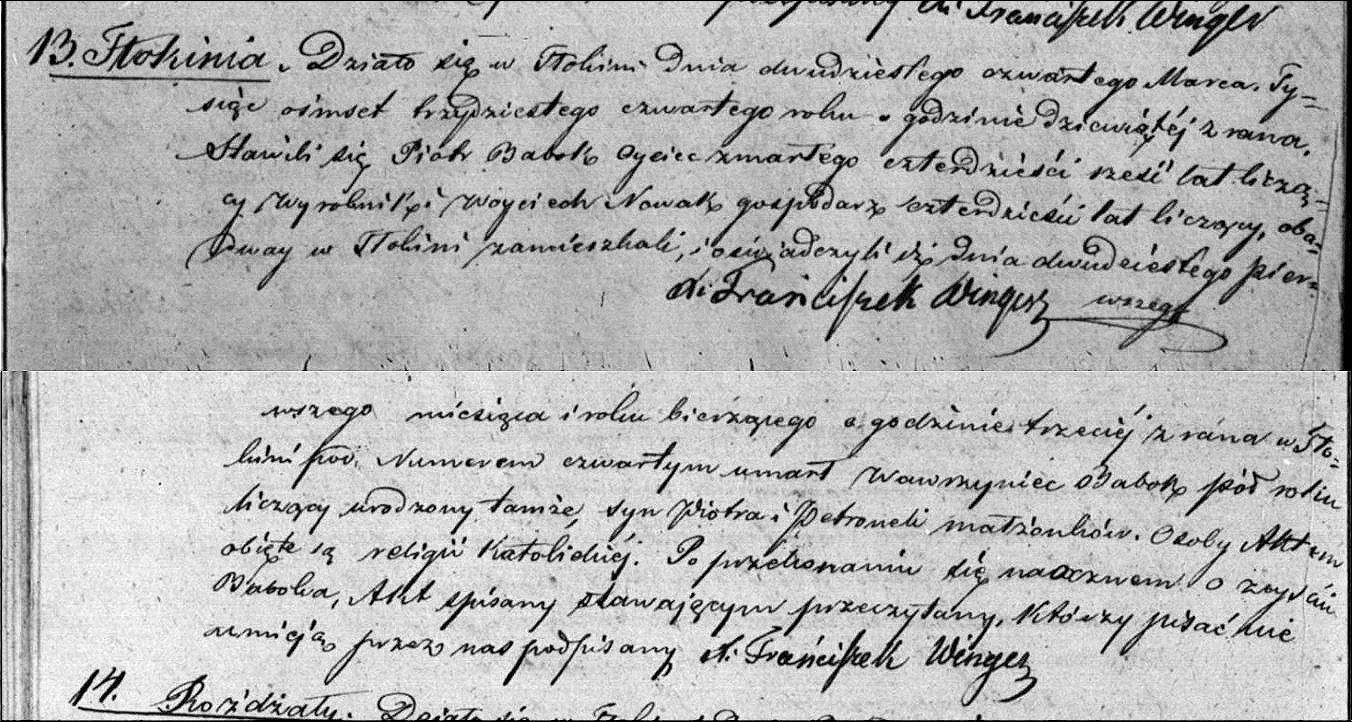 Death Record No. 13, Tłokinia, Kalisz, Wielkopolskie, Poland, of Wawrzyniec Grala alias Babok, who died in Tłokinia, House No. 4, on 21st March 1834, death reported on 24th March 1834, he lived a half year, he was born in Tłokinia, son of Piotr and Petronela, married couple Babok. Death reported by Piotr Babok, father of the deceased, 46 years old, a laborer, and Wojciech Nowak, a farmer, 40 years old, both residents of Tłokinia.