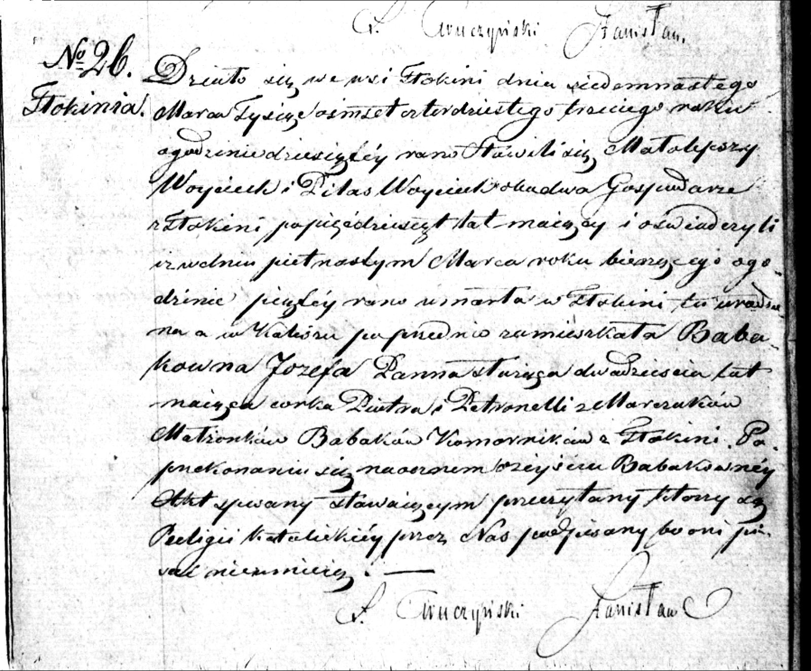 Death Record No. 26, Tłokinia Parish, Kalisz, Wielkopolskie, Poland, of Jozefa Babak (or Babakowna = daughter of Babak), who died in Tłokinia on 15th March 1843, at 5 am, she was born here (in Tłokinia), death reported on 17th March 1843, at 10 am, she lived earlier in Kalisz, she was 20 years old, she was a maiden, worked as a servant, daughter of Piotr and Petronella, born Marczak, married couple Babak, tenant farmers in Tłokinia. Death reported by Wojciech Małolepszy and Wojciech Pilas, both farmers in Tłokinia, each 50 years old, both Catholics.