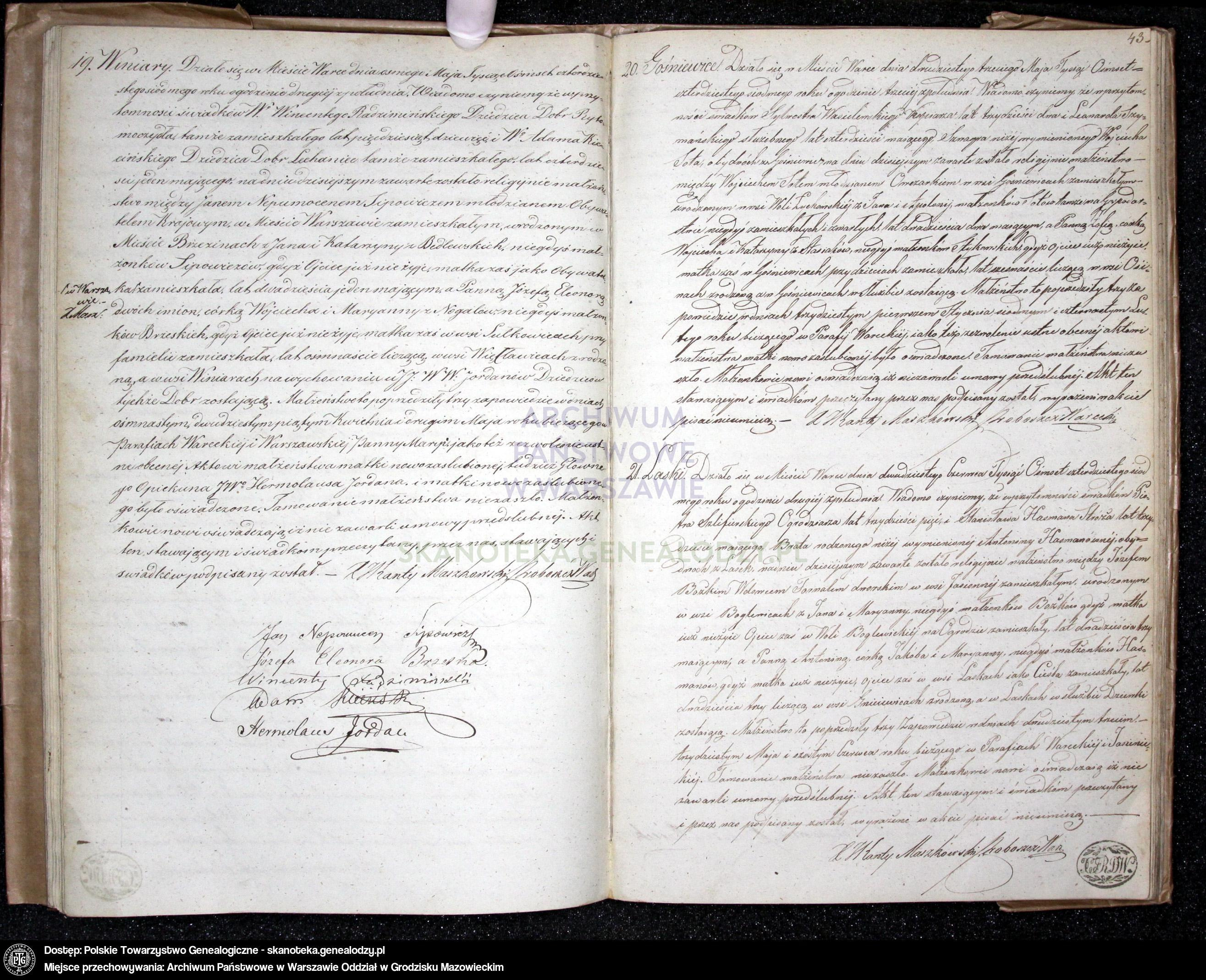 Marriage Record No. 19, Warka Parish, dated 8th May 1847, of Jan Nepomucen Sipowicz, a young man, citizen, living in Warszawa, born in Brzeziny, son of Jan and Katarzyna, born Bendlewska, married couple Sipowicz, father deceased and mother living as a citizen in Warszawa, he is 21 years old, and of a maiden, Jozefa Eleonora Brzeska, daughter of Wojciech and Marianna, born Nogal, married couple Brzeski, father deceased, and mother stays in village Sułkowice with her family, she is 18 years old, she was born in village Więcławice, and in village Winiary she is being cared for by JJWW Jordan, Landowners of this land. This marriage was preceded by three Marriage Banns published on 18th, 25th April and 2nd May of the current year in Warka Parish and in Warszawa Parish of St. Virgin Mary. The oral permissions of mother of the bride and of the main guardian JW Hermolaus Jordan, and of mother of the groom were stated. No impediment detected. No prenuptial agreement. Witnesses: Nobleman Wincenty Radziminski, landowner of Rytomoczydła land, there living, 59 years old, and Nobleman Adam Kiecinski, landowner of Lechaniec land, there living, 41 years old. Signatures of Jan Nepomucen Sipowicz, Jozefa Eleonora Brzeska, Wincenty Radziminski, Adam Kicienski and Herniolaus Jordan.