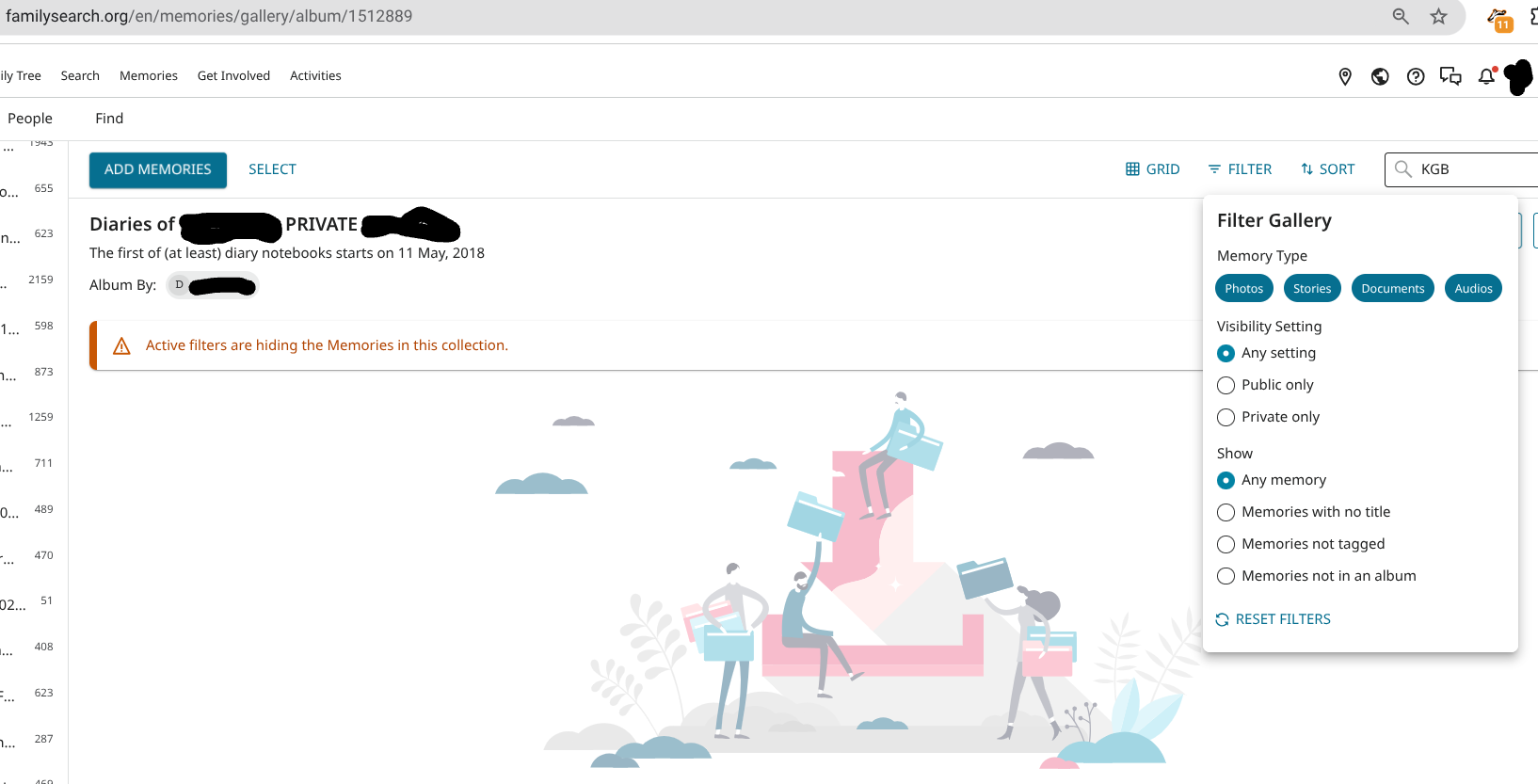 I'm getting the same error message as before, even though I know for sure that there is one PDF containing "KGB" in the diary album above.