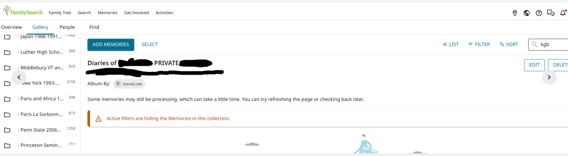 So, if you are in an Album, but you are searching for something in your Gallery, then the search box won't work appropriately, and you will be given the error message that you show above: "Active filters are hiding the memories in this collection."