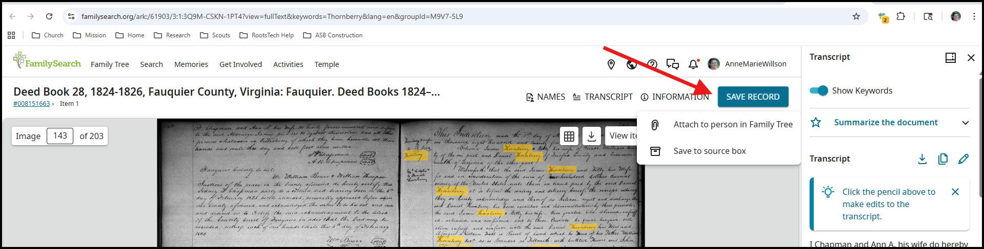 Of course you can also click the Save Record button to either attach the record & transcript to a profile in FamilySearch Tree or save it to your Source Box to come back to later.