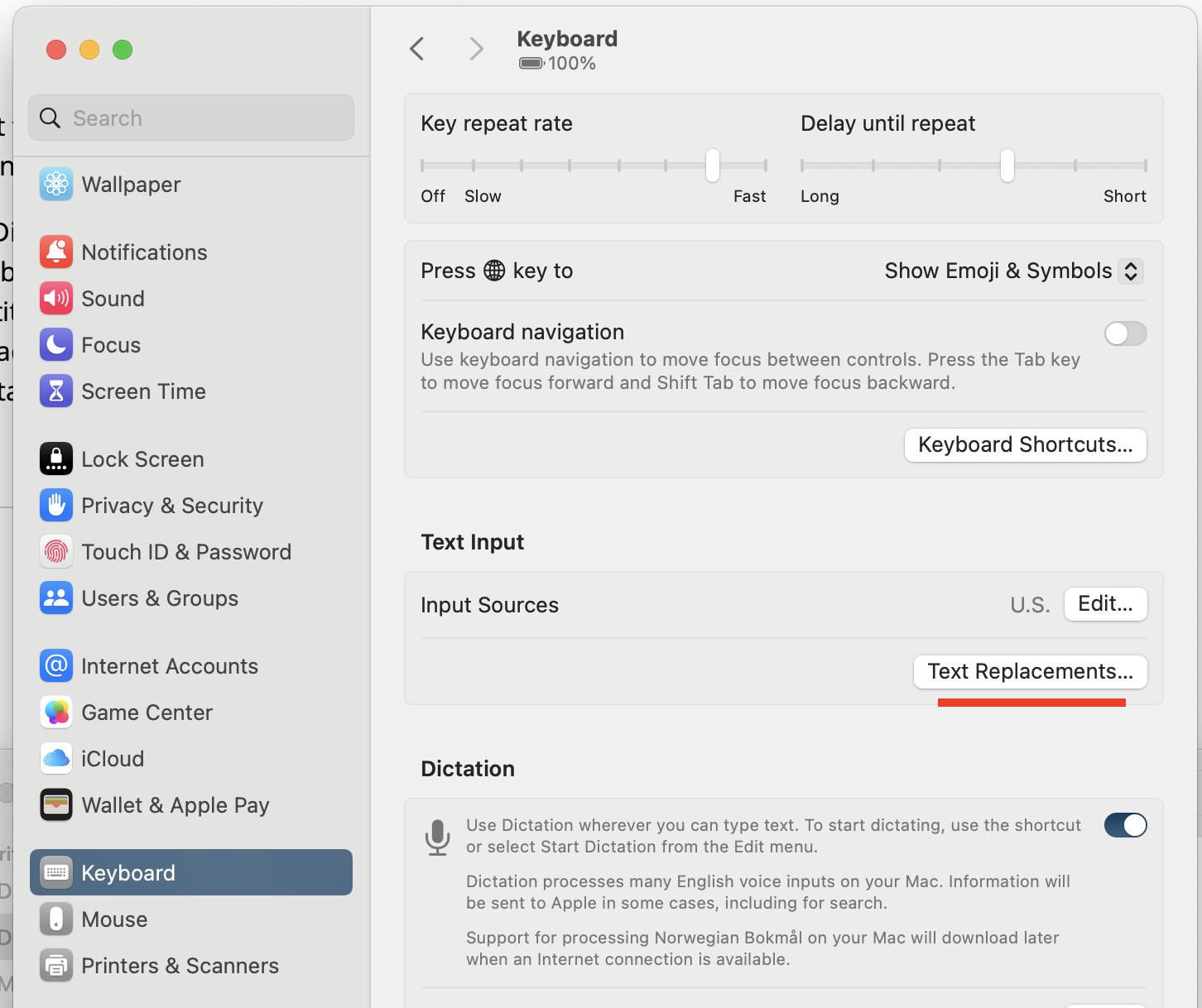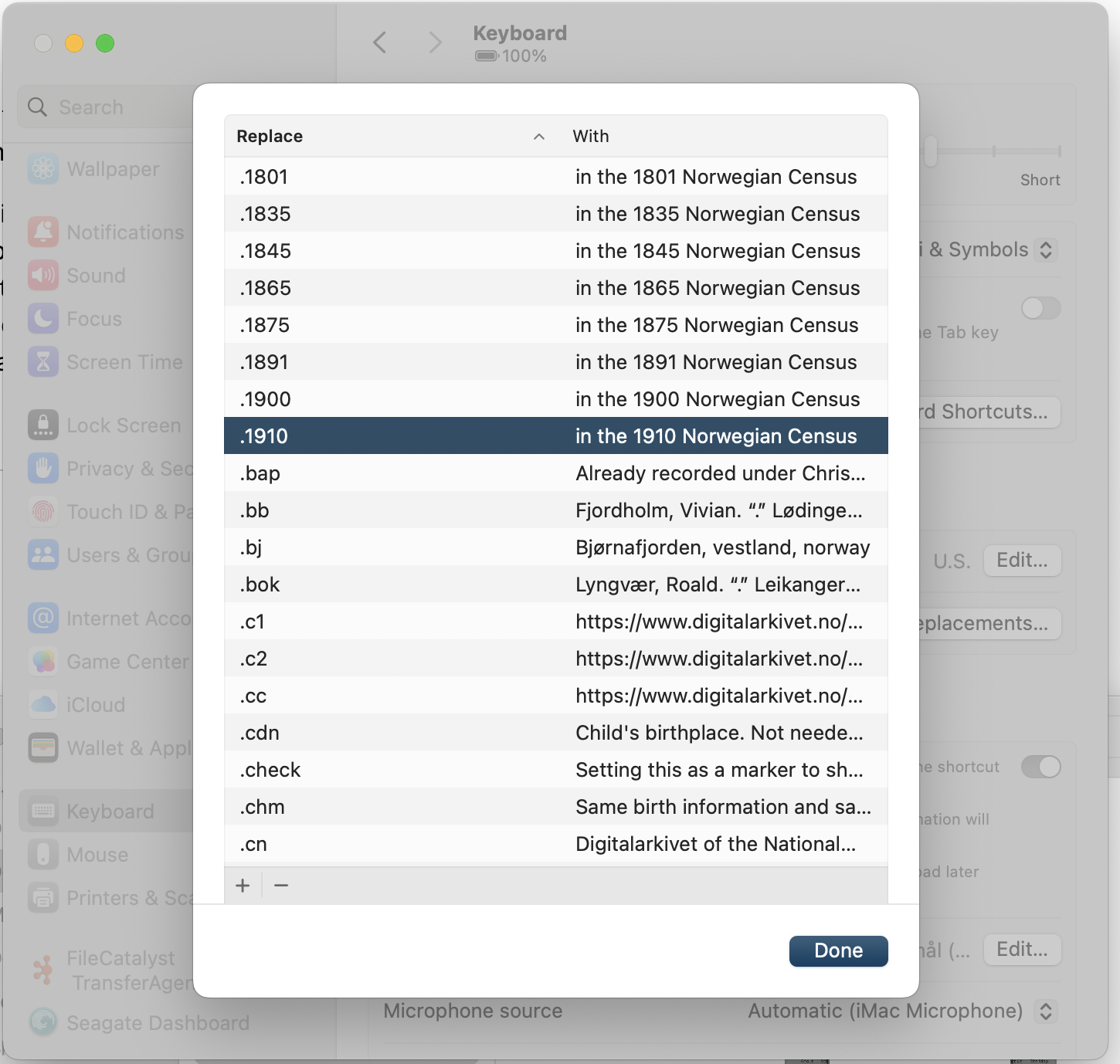 Then I can just type in the short code on the left and it expands to the longer, sometimes much longer, phrase on the right. I find it much more efficient than having a list of phrases in a text file that I then have to go to in order to copy and past the phrase. Not all applications allow their use. Firefox, for example, ignores the codes and just leaves them as they are. I don't know if the Windows operating system has such a feature.