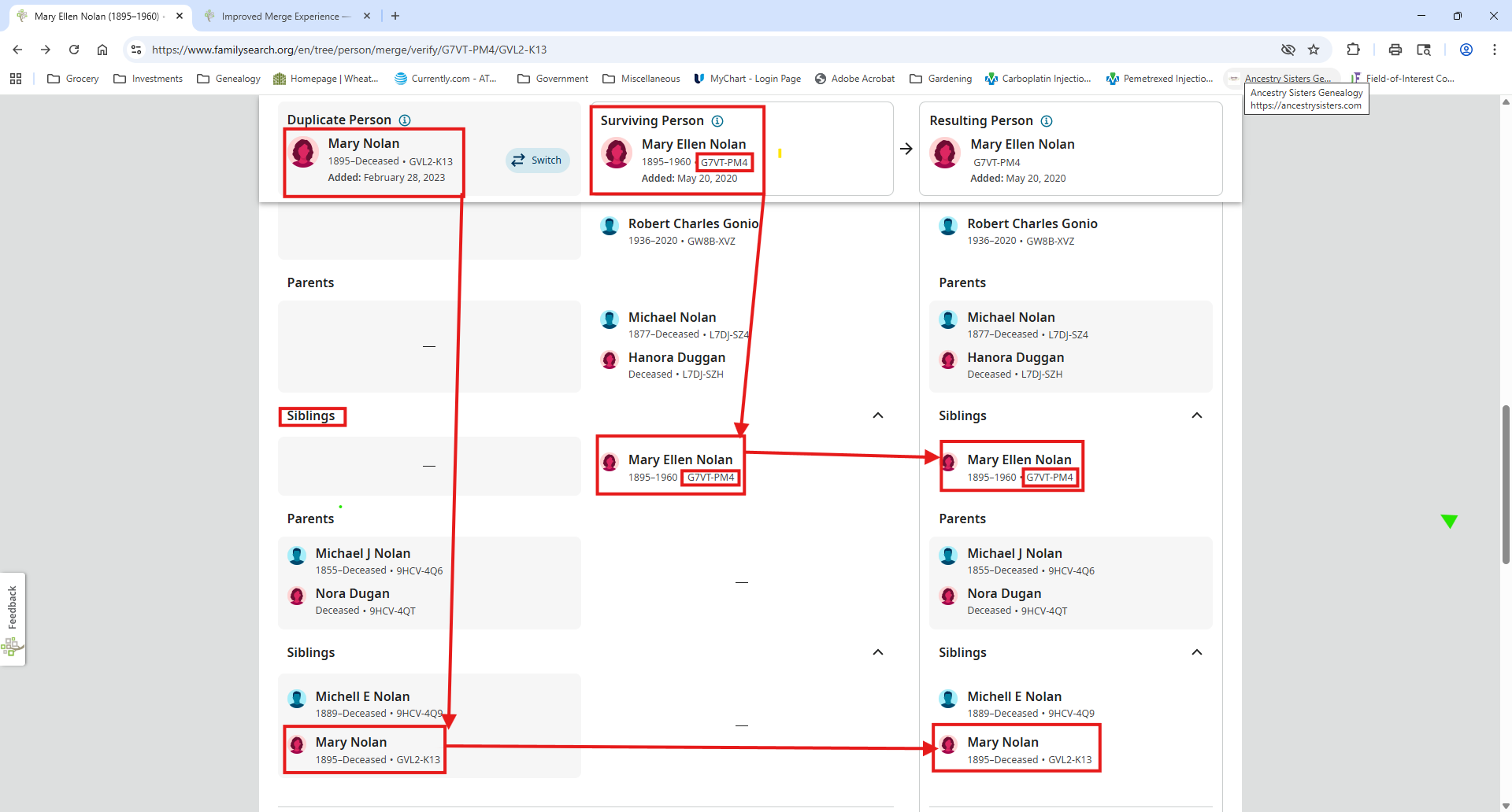 @KarenSepke what you are seeing is Mary Nolan with a set of parents that are different from Mary Ellen Nolan. Before any merging happens, you will need to find out if Mary and Mary Ellen are indeed the same person.
