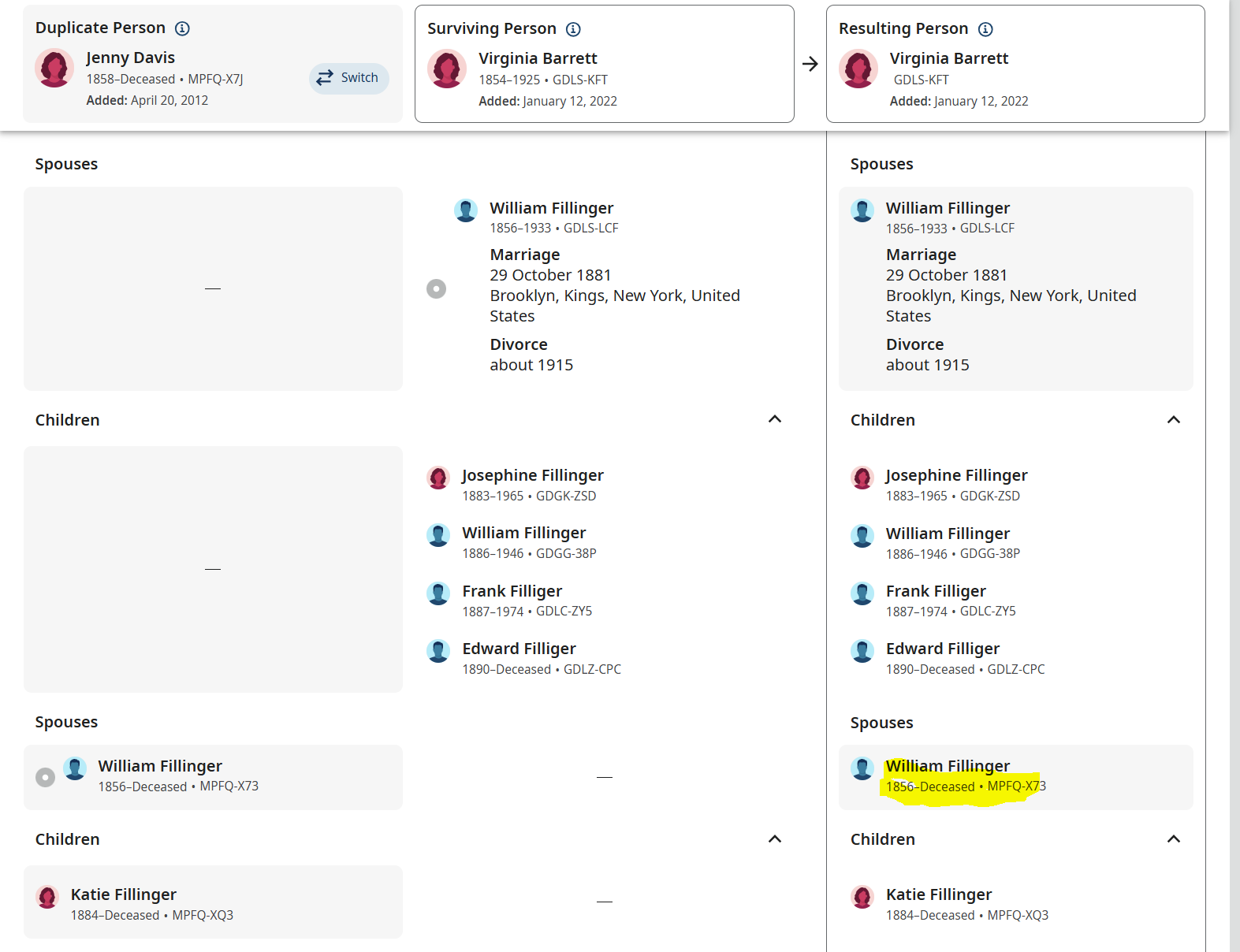 Until recently, when I was merging and found a spouse or other relative who was also duplicated, I could open one in a new tab and copy the idea of the other. Then, when I was done with the first merge, I could easily do the second.