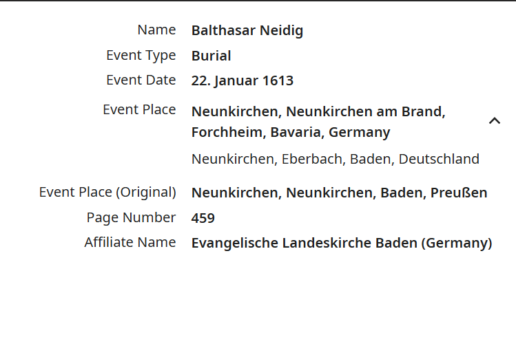 I am wondering if any one else sees this kind of error. The place of the record is actually Neunkirchen, Mosbach, Baden. I can edit it later in the sources and in the details of the person, but it happens 90% of the time, at least inthis area of Germany. I cannot explain why this happens like this. If you look at the catalog entry by film number (Microfilm #102060673, Image 834 of 1098, the placename is correct. But not in this part where if I am not watching it will add an entirely different place, but similar name.