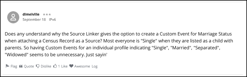 That is an interesting point that hadn't occurred to me, I must admit. We need things like "married" on a census record to enable (potential) searching on it. And if the potential load onto the profile is simply a full list of all the items, one by one, then my comment about it being a waste of time to program them, isn't right because it'll just loop round all the items regardless - no extra programming needed.