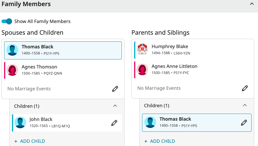 In the Latest Changes box, click on Show All then scroll down to the very first entry. There you will see that just this past June, a user created this profile for Thomas Black with birth in 1490. A child John with birth year 1520 was added. Then his wife and the mother of John, Agnes Ann Littleton born 1500 was added. That was all that was done. Unfortunately this user did not add any sources to support any of this.