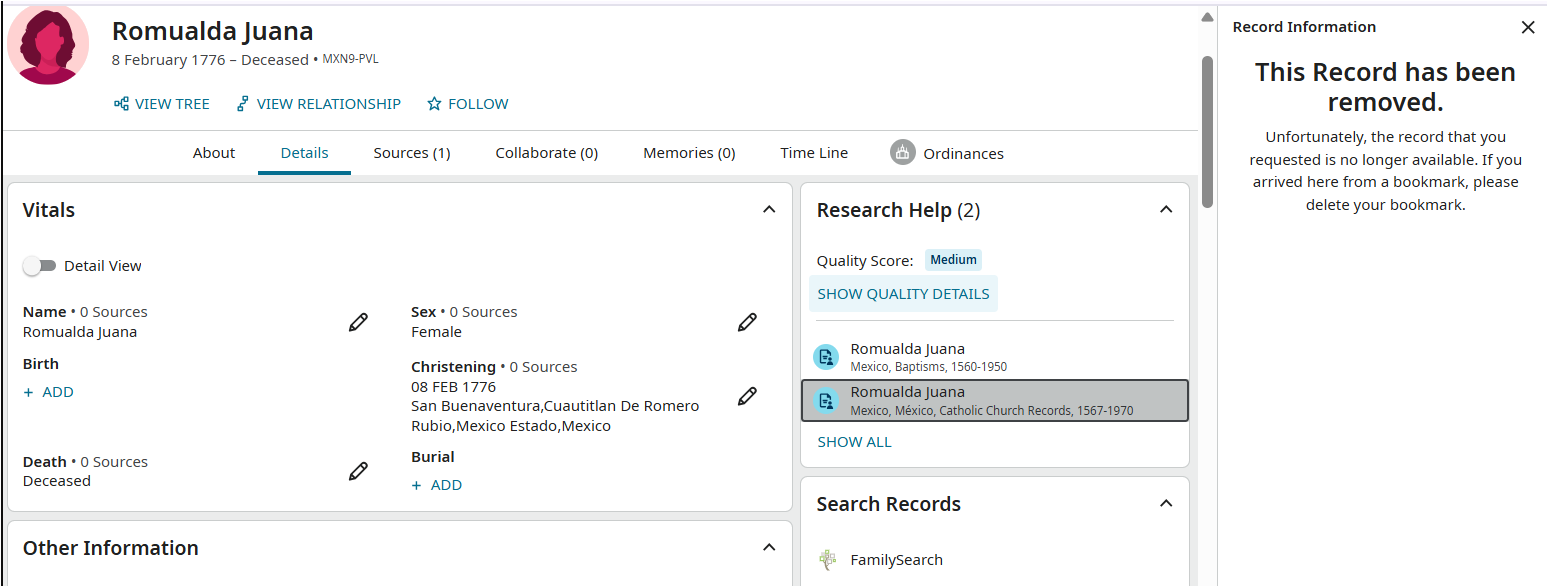 Christening of Romualda Juana (MXN9-PVL), dated 8 February 1776 at Cuautitlán, now in State of Mexico, Mexico. Two sources suggested under "Research Help", but when I click on one of them I get the message "This Record has been removed."