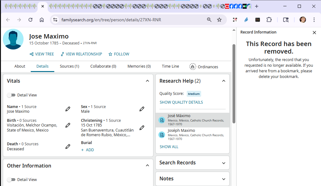 I will watch to see if the record for Jose also comes back. Right now it is still in limbo: https://www.familysearch.org/ark:/61903/3:1:939X-DP91-9G?view=index&groupId=&lang=en&personArk=%2Fark%3A%2F61903%2F1%3A1%3A6865-CH32&action=view