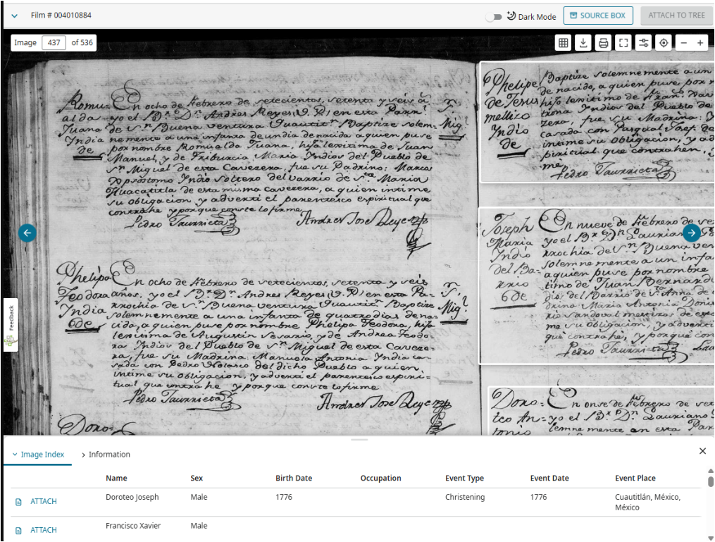 José Maximo, christened 15 October 1785 at Cuautitlán, State of Mexico, Mexico (at that time, in New Spain, within easy mule-ride or a long day's walk from Mexico City), ID 27XN-RNR, has a suggested source "José Máximo / Mexico, México, Catholic Church Records, 1567-1970". However, when I click on it, I get an error