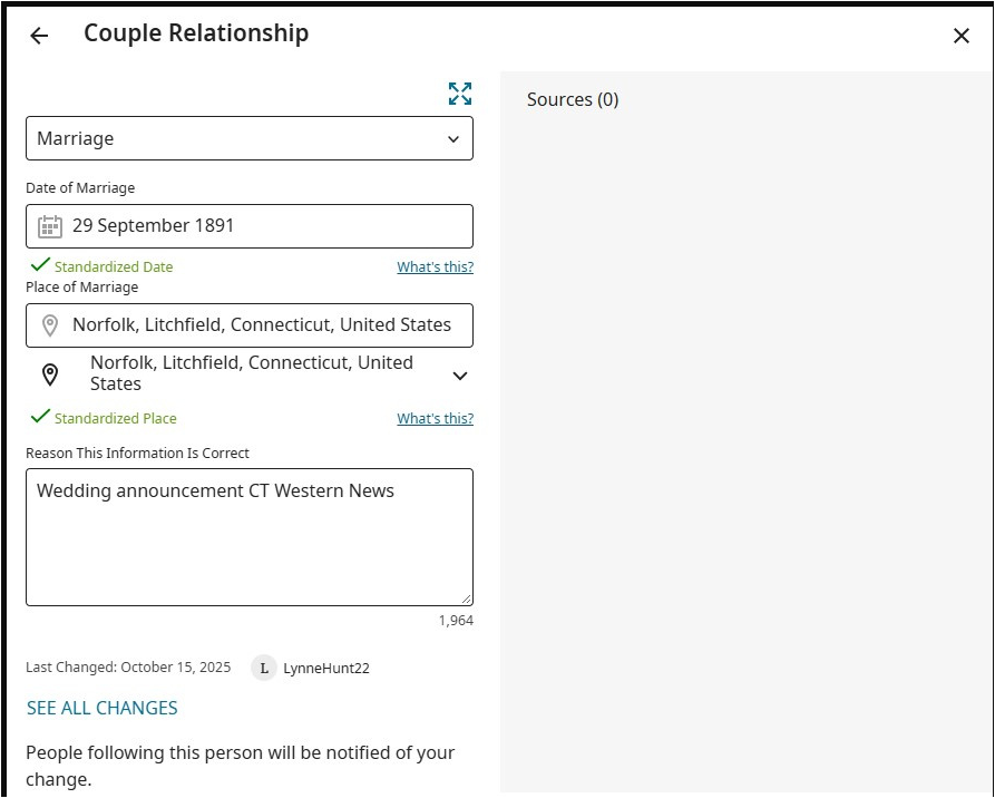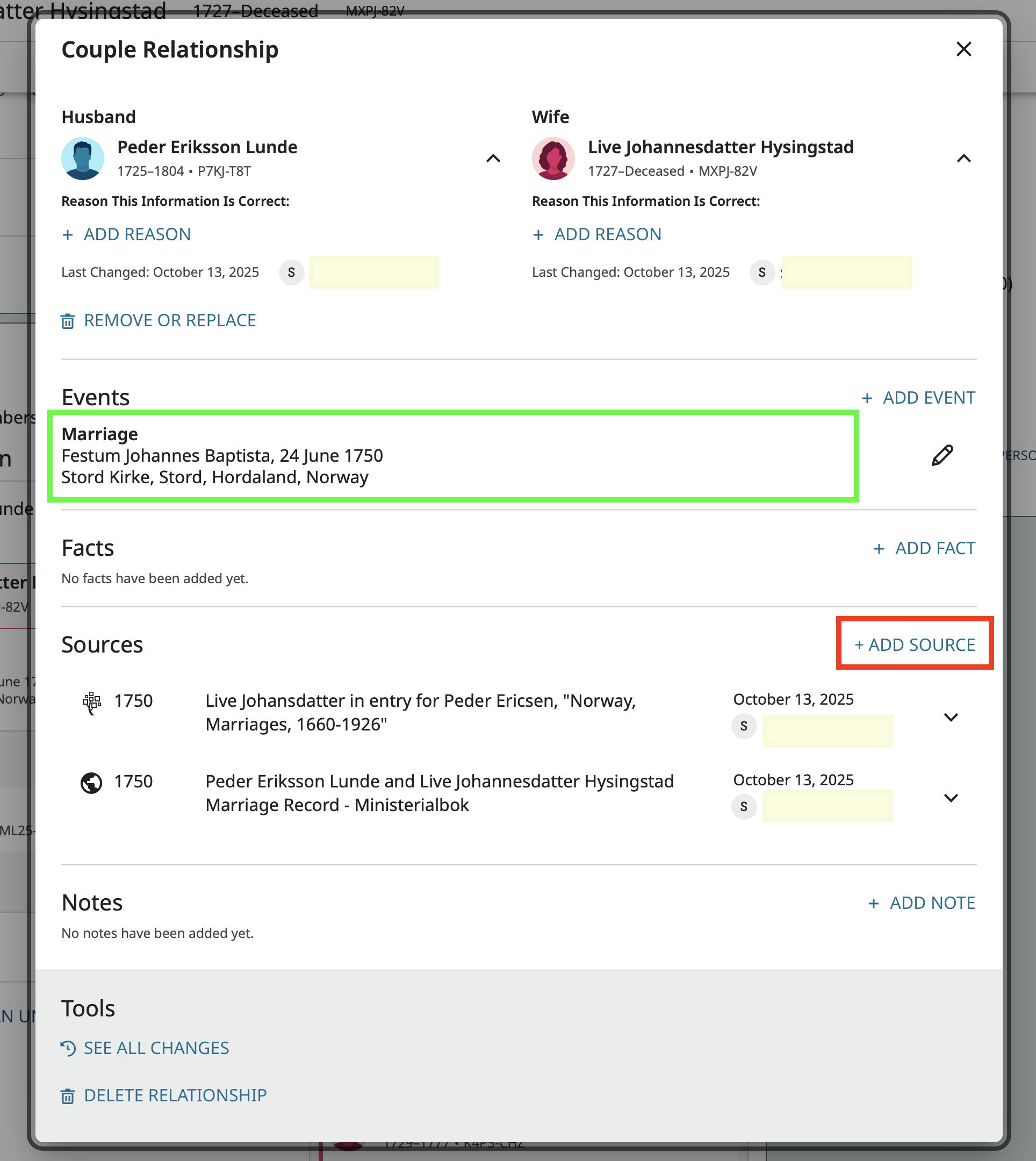 Click in the red box to add sources to the Couple Relationship. After adding sources, then click inside the green box to open this pop up: