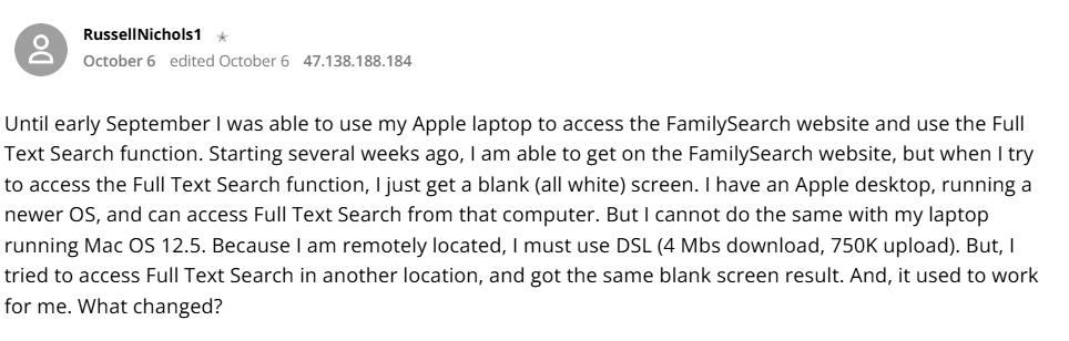 Have recent changes to Full Text Search disabled networking with my Apple laptop?