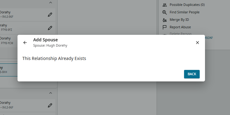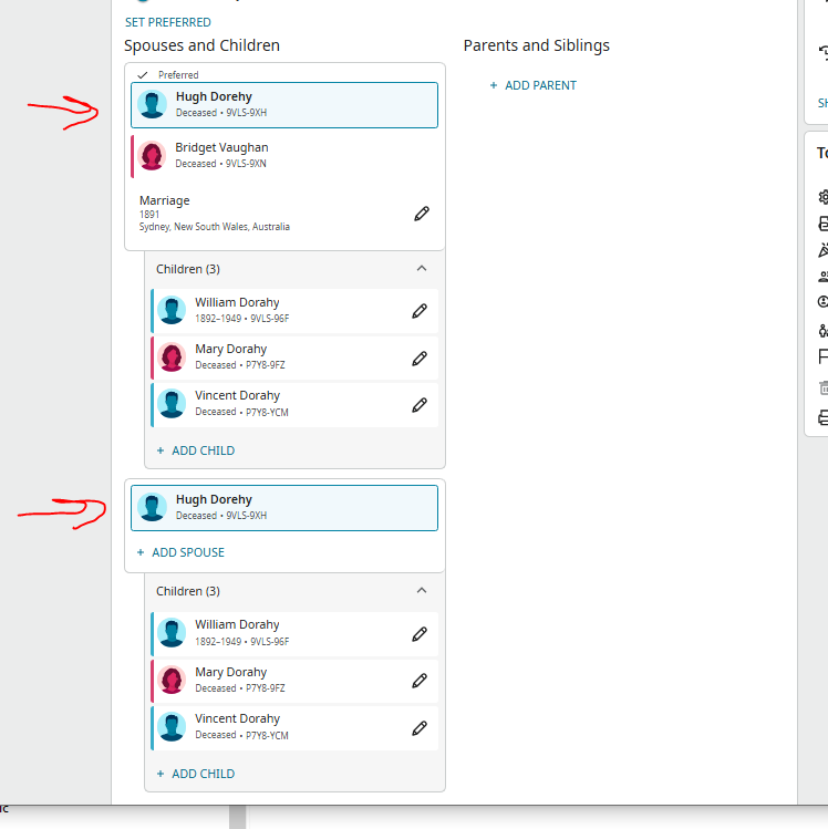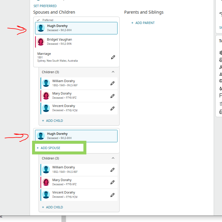 It seems I first created a second wife like the husband and thought RATS, mistake, but then went to each child and saw in the drop down box the other siblings under the duplicate name. As I deleted the relationship in each one in the list the dup disappeared. Then went to each sibling and did the same. It worked. That is probably what you meant to say but as I say somethings its hard to understand in this forum what is meant, well for me anyway. Anyway On that things are solved thank you again !😊