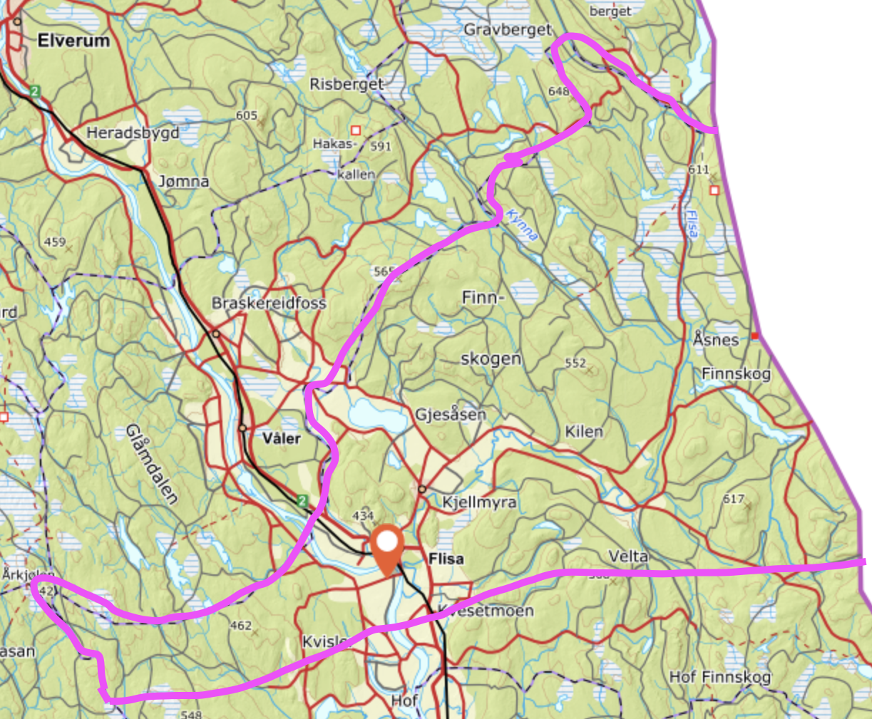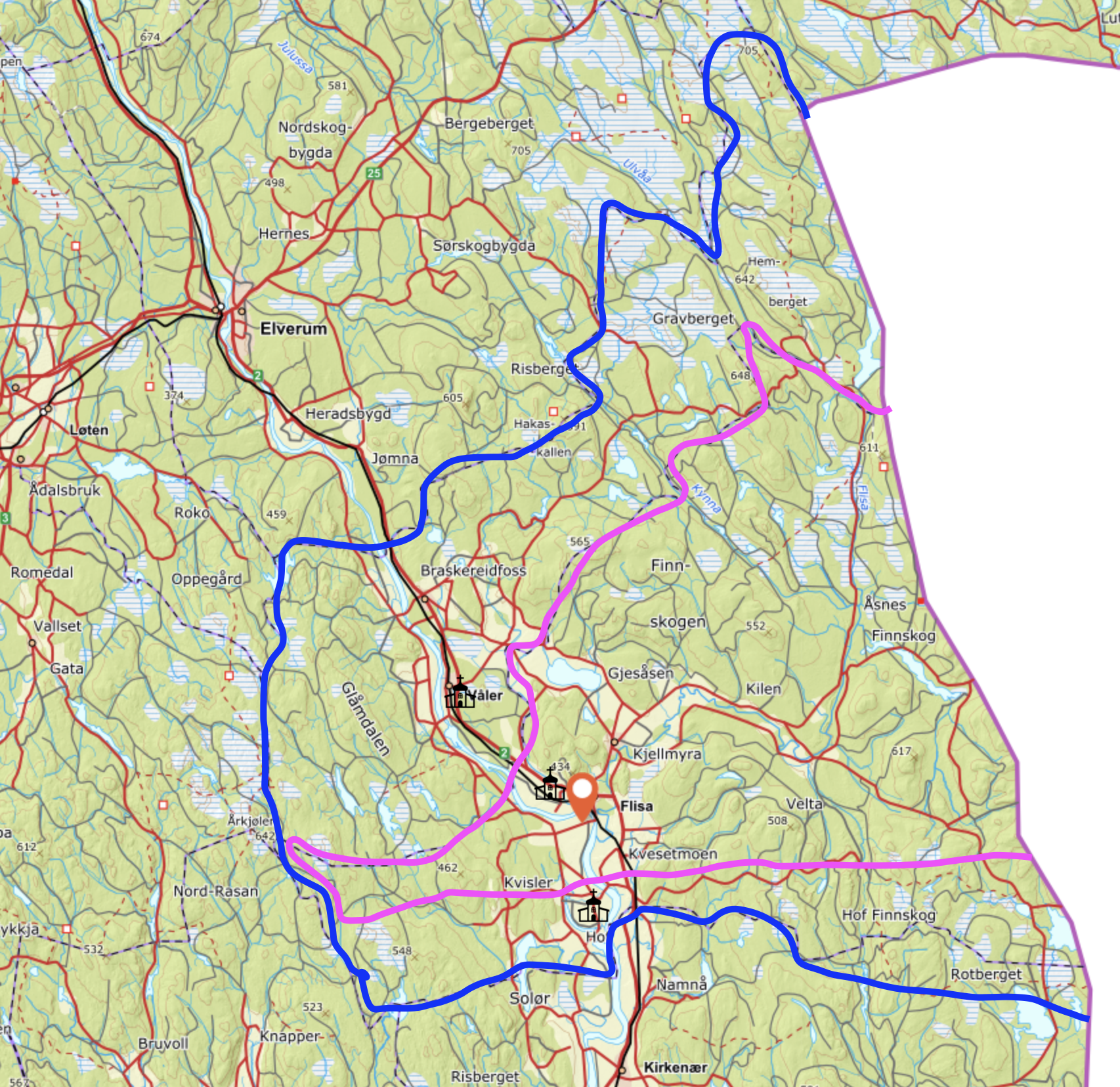 Here I have also place markers for, from top to bottom, Våler church, Åsnes church, and Hof church. The area above the upper pink line was Våler sogn and the area below the lower pink line was Hof sogn.