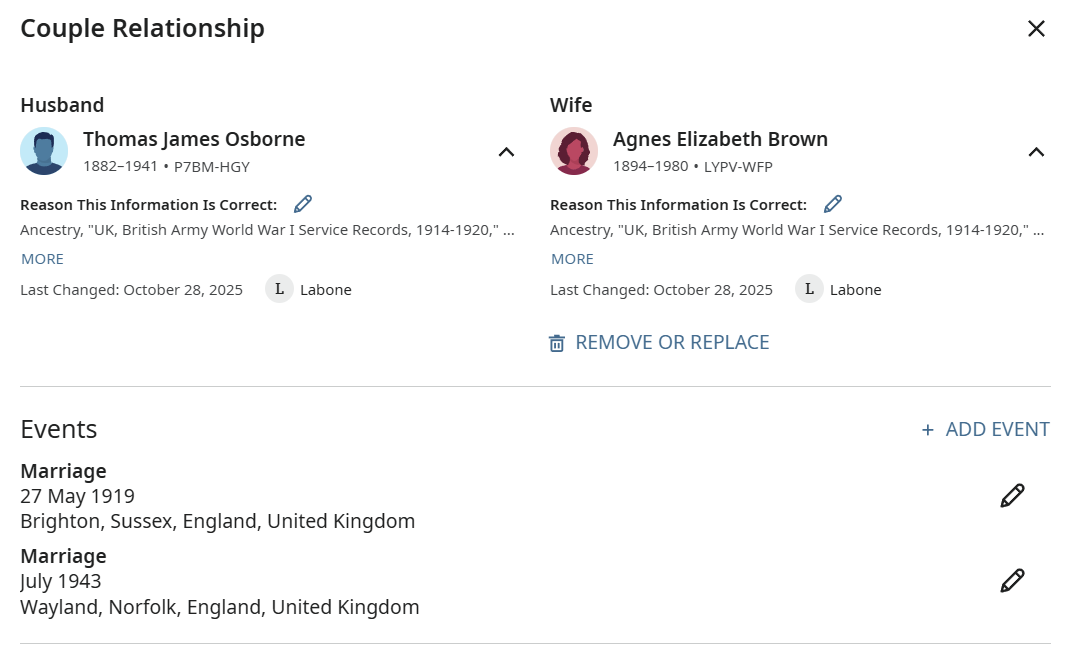 If you open the Couple Relationship, there are two marriage dates listed. Only the earlier one will display on the front page of the profile. If you open the relationship, there is a later July 1943 marriage listed. That is the error the DQS is calling out.