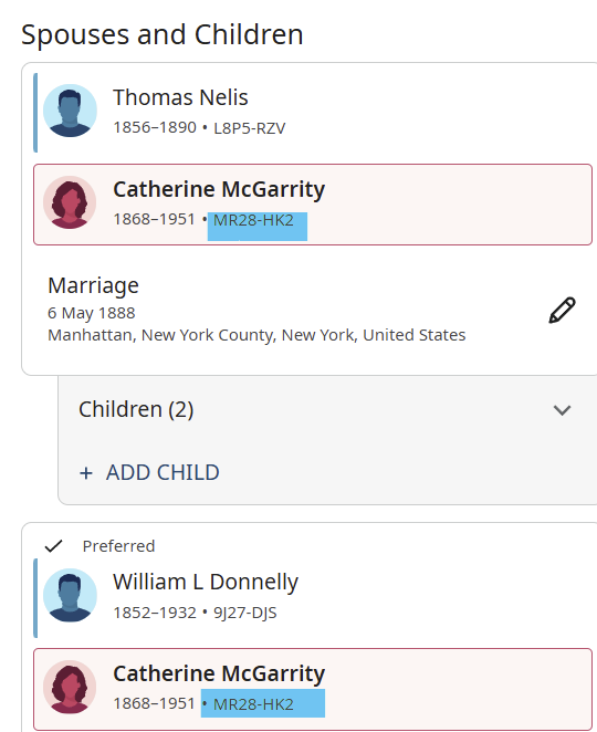 As an example, this is my great-grandmother, who was married twice. She is listed twice, once with each husband, but only one PID.1