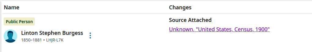 Someone has just updated the 1900 census attached to his wife because the source linker lists him as "unknown."