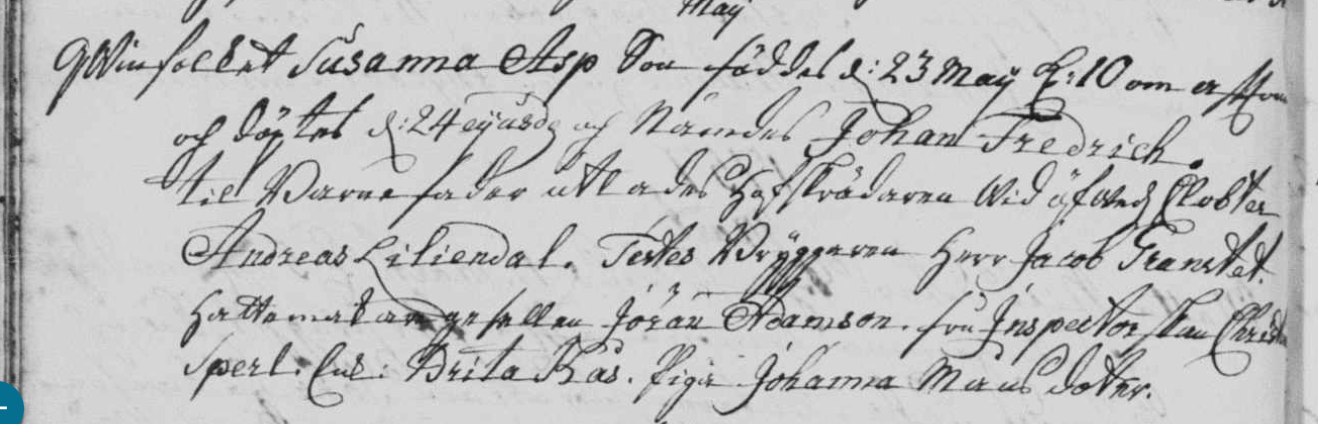 The record reads as follows: "Woman Susanna Asp [a] son born the 23rd of May at 10 o'clock pm and baptised the 24th of the same month [May 1758] and named Johan Fredrich. The father is said to be the court tailor at Öfveds Closter, Andreas Liliendal. Witnesses: the brewer Mr. Jacob Granstet, the journeyman hat maker, Jöran Adamson, Mrs. Inspectorska Christina Sperl, widow Brita Kås, maiden Johanna Månsdotter."