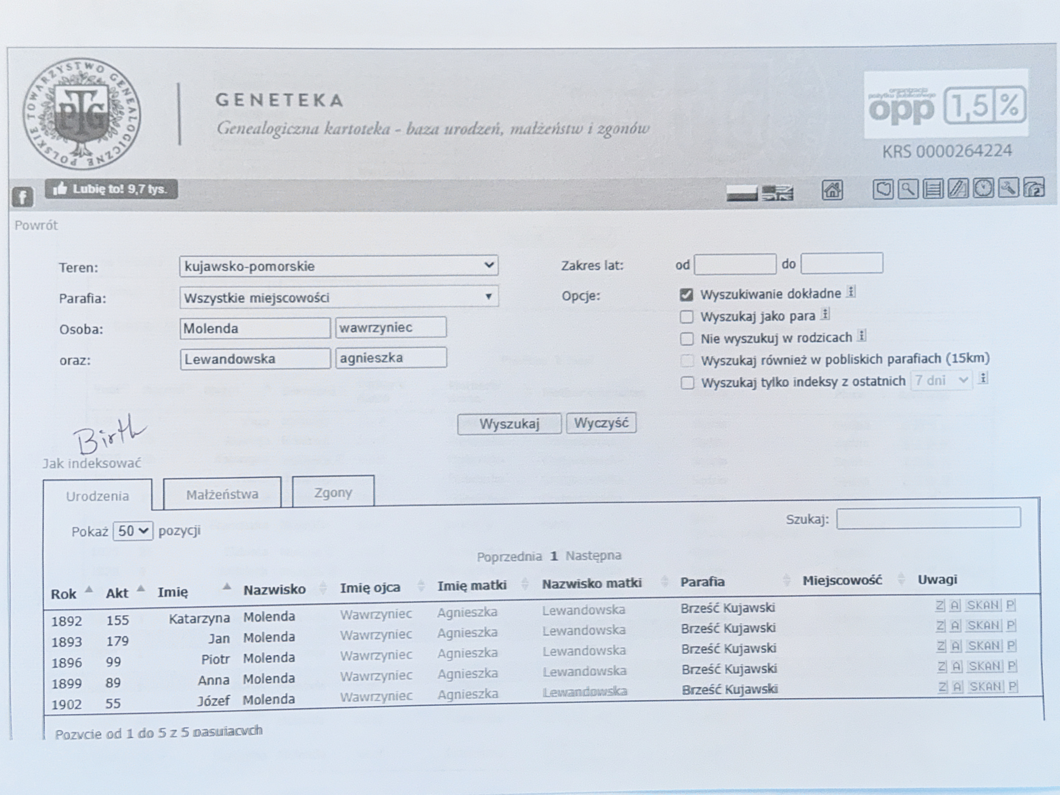 Please pardon us from asking a simple question but we are very new to this. (name removed) was kind enough to find our relatives in a Polish archives search in Geneteka (attached is a picture of what she printed for us). We want to know if we use this page as a source for the relatives she found. These are indeed our relatives. If we use this website as a source how do we find it to use it? With the language barrier, we are not able to find it. (Name removed) , thank you so much for your help in finding the source again.