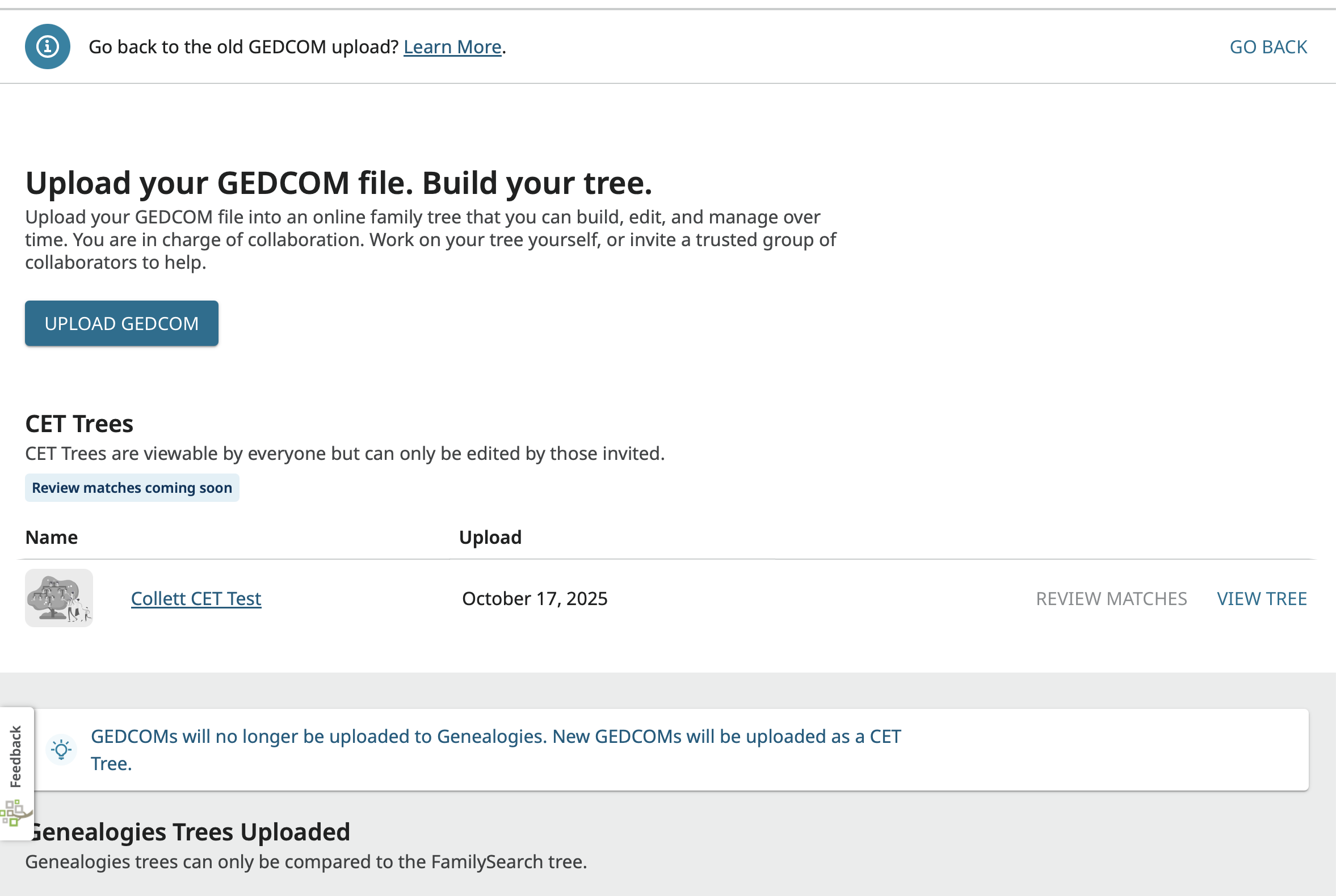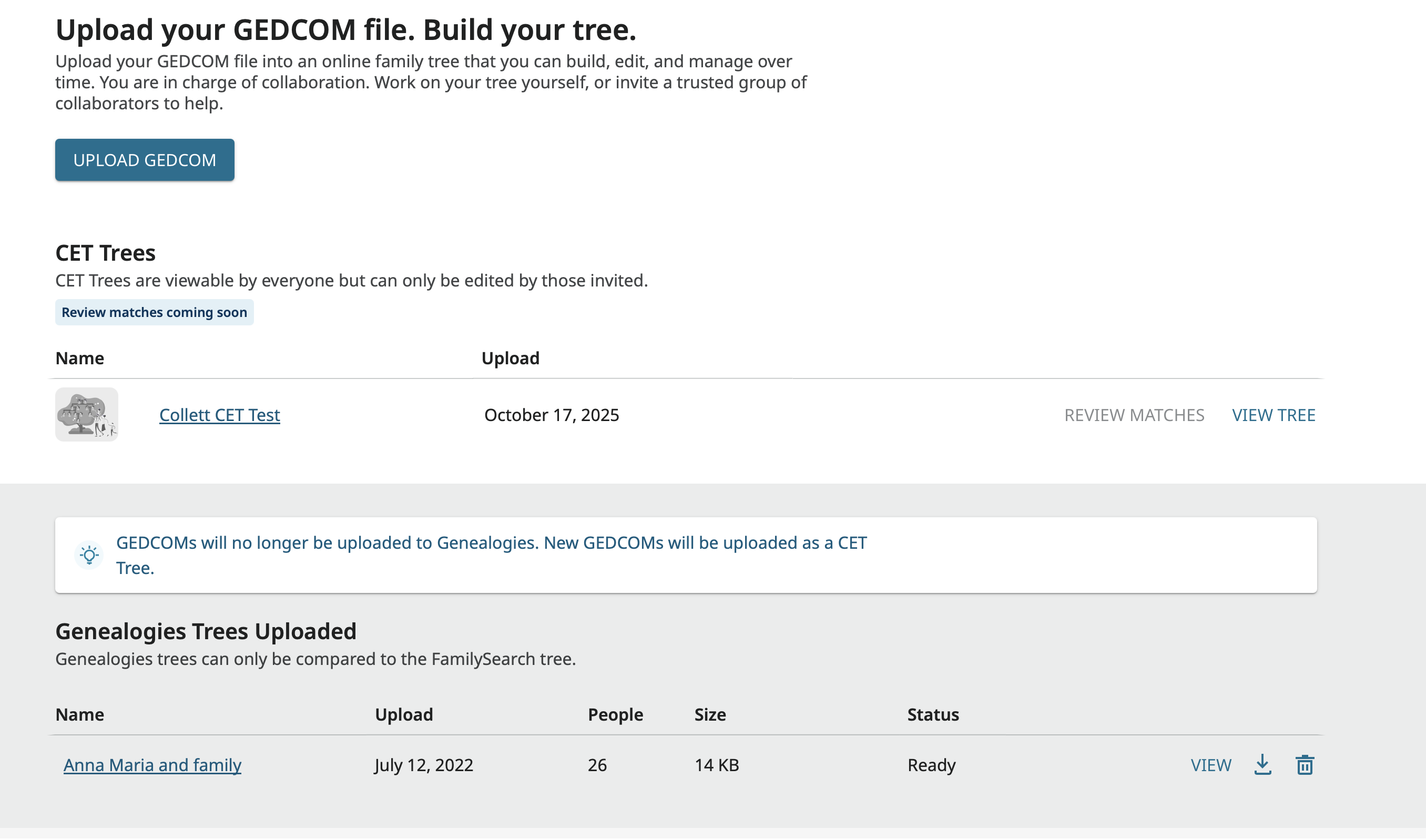 Question: if I've already uploaded my GEDCOM file (it shows up in the bottom of the Genealogies upload page, without the bit about CET Trees). Will it become part of CET once I'm included in the rollout? Or will I need to re-upload my GEDCOM file?