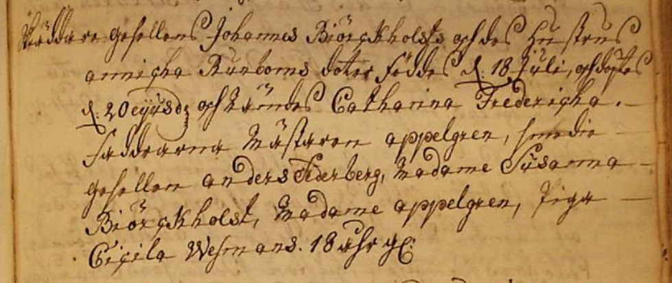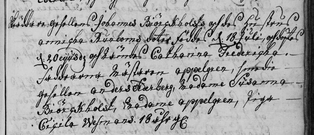 Skräddare gesellen Johannes Biörckholsts och des hustrus Annicha Runborns doter föddes d: 18 Juli, och döptes d: 20 eijusd och nämdes Catharina Fredericha. Faddrarna Mästaren appelgren, __? gesellen anders Karberg, Madame Susanna Biörckholst, Madame appelgren, Piga Cecila Wesmans. 18 åhr gl: