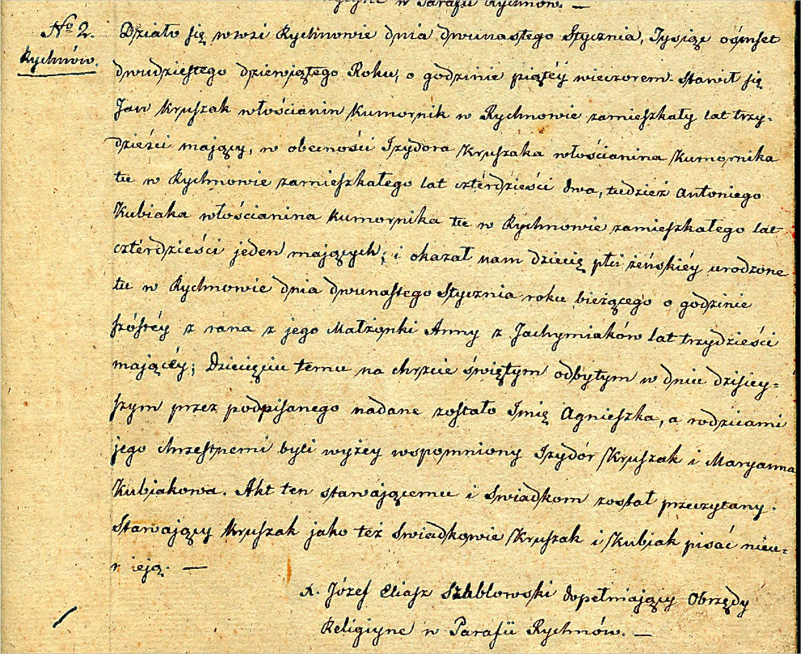 Birth Record No. 2, Rychnów, parish of Rychnów, Kalisz, of Agnieszka Kruszak, born in Rychnów on 12th January 1829, at 6 am, christened on 12th January 1829, at 5 pm, daughter of Jan Kruszak, a tenant farmer from Rychnów, 30 years old, and of his wife, Anna, born Jachymiak, 30 years old. Witnesses: Izydor Kruszak, a tenant farmer from Rychnów, 41 years old, and Antoni Kubiak, a tenant farmer from Rychnów, 41 years old. Godparents: the above-mentioned Izydor Kruszak and Marianna Kubiakowa (wife of Kubiak).
