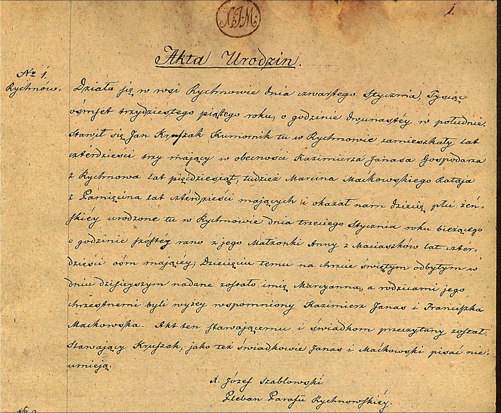 Birth Record No. 1, Rychnów, parish Rychnów, Kalisz, of Marcyanna Kruszak, born in Rychnów on 3rd January 1835, at 6 am, christened on 4th January 1835, at noon, daughter of Jan Kruszak, a tenant farmer, resident of Rychnów, 43 years old, and of his wife, Anna, born Maciaszek, 48 years old. Witnesses: Kazimierz Janas, a farmer from Rychnów, 50 years old, and Marcin Maćkowski, a laborer in grange, from Pamięcin, 40 years old. Godparents: Kazimierz Janas and Franciszka Maćkowska. This record was read and signed.