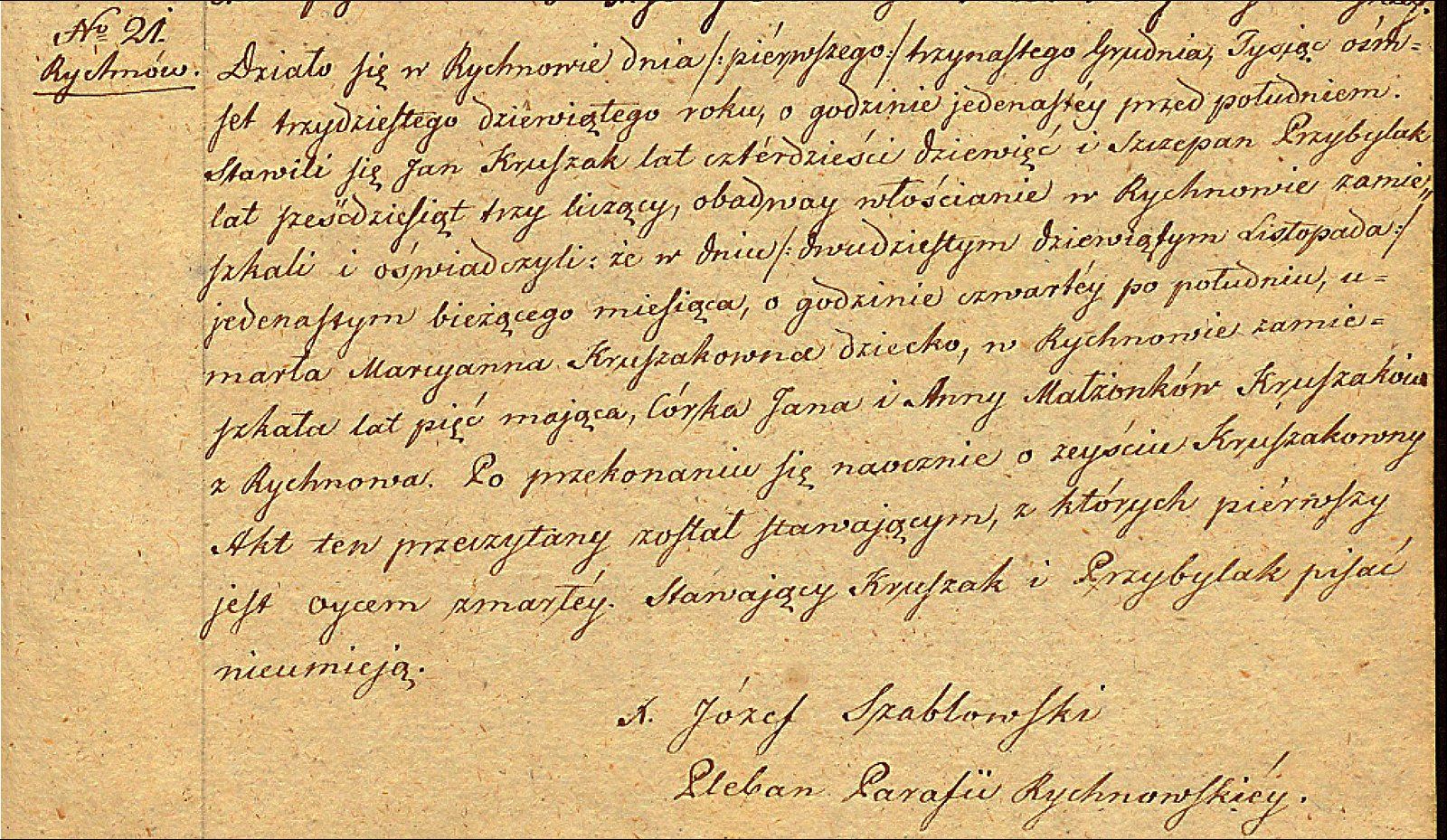 Death Record No. 21, Rychnów, parish Rychnów, Kalisz, of Marcyanna Kruszak, who died in Rychnów on 11th December 1839, at 4 pm, death reported on 13th December 1839, at 11 am, she was 5 years old, daughter of Jan Kruszak, 49 years old, and of his wife, Anna, married couple Kruszak from Rychnów. Death reported by Jan Kruszak, father of the deceased, and Szczepan Przybylak, 63 years old, both peasants from Rychnów. After confirming with my own eyes the death of Marcyanna Kruszak, this record was read and signed.