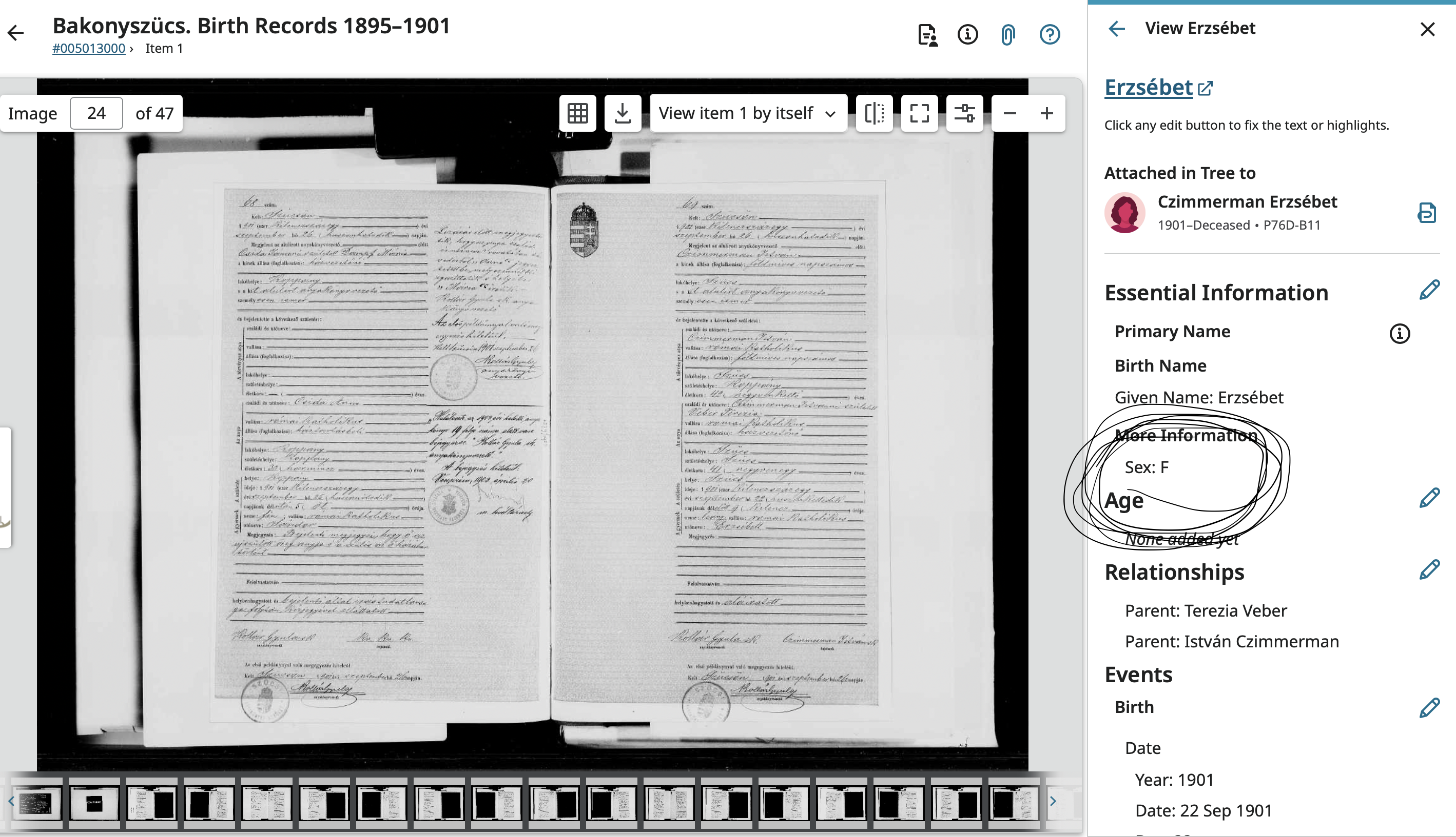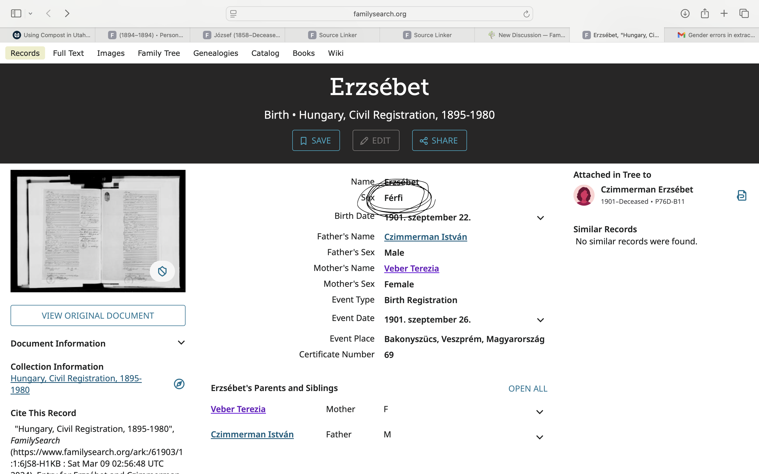 When I bring up her birth record in sourcelinker, she appears as a son. When I checked the image for the birth record, it clearly states that the child is a daughter. However, if I click "View record" from source linker, the sex is listed as "Férfi" (Hungarian), meaning "Male" (English).