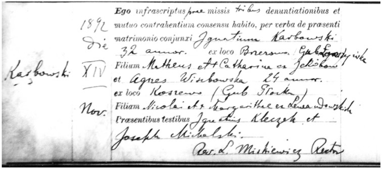 I the undersigned, after publishing Marriage Banns I have the mutual consent of the contracting parties, and I have joined together in this marriage Ignatus (Ignacy in Polish) Karbowski, 32 years old, from Brzozowo, Gubernia Lomza, son of Matheus (Mateusz) and Catherina (Katarzyna), born Jekob (Jakob), and of Agnes Wierzbowska, 24 years old from Koszewo, Gubernia Plock, daughter of Nicolaus (Mikolaj) and Margaritha (Malgorzata), born Lewandowska. Witnesses: Ignatius (Ignacy) Kleczak and Joseph (Jozef) Michalski. Dated 14th November 1892.