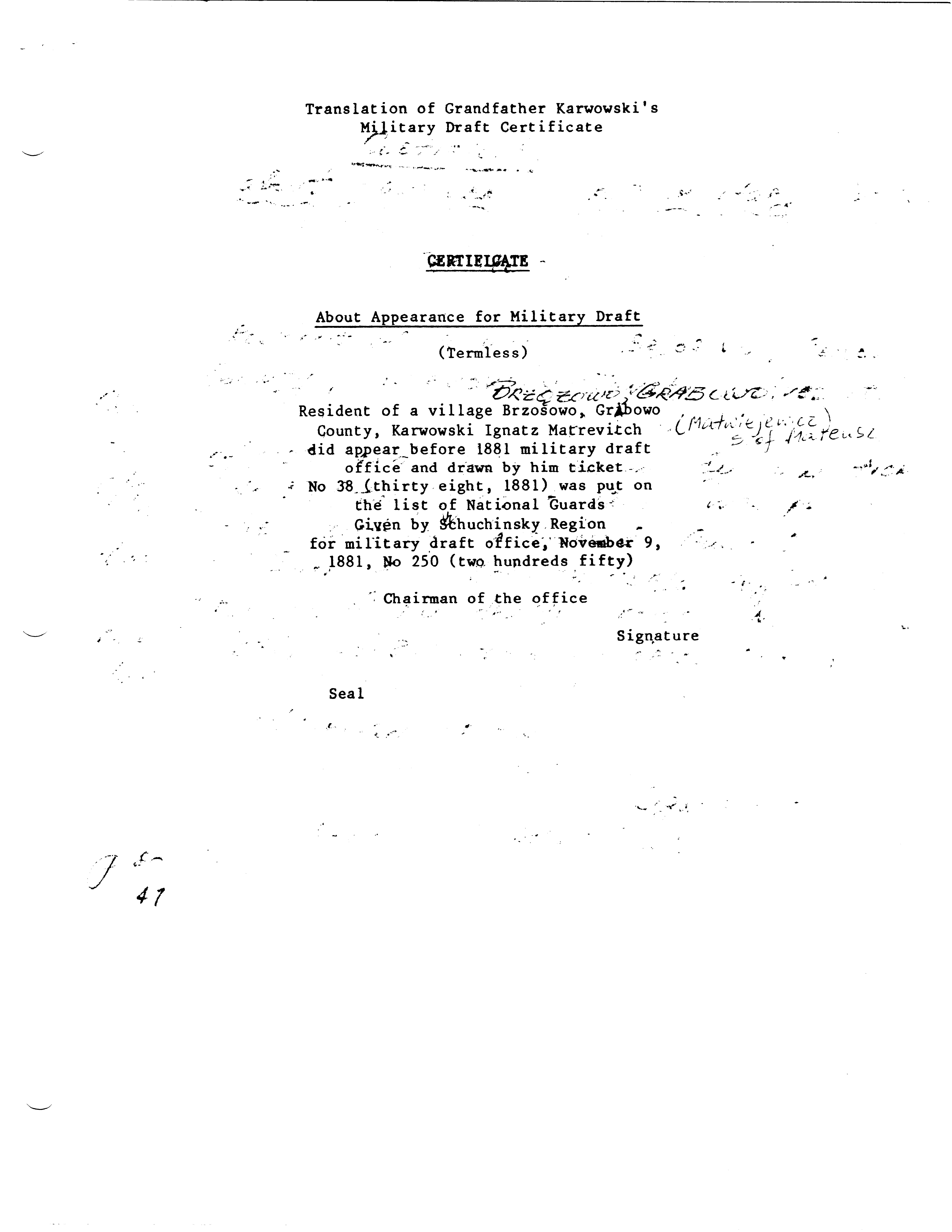 The first document is his Russian military draft document dated 1881. The second document is a translation of it. The third document is his church marriage record to his wife Agnes Wierzbowska in 1892 from St. Adalbert's Catholic Church, Pittsburgh, PA.
