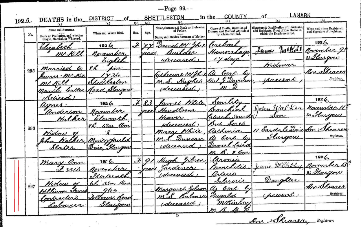 But am thankful for all notes. Amongst doing many house things right now, got to clean the leaves out of eves etc. winter and so on. I thought I would start by downloading the death docs of Mary Ann, I mean you could spend a life time looking just to save a few dollars. Scotland is prety cheap for their documents, that's nice. Well Each document is a gold mine as you said. So It looks like Mary Ann is a sister of Johnston / Daughter of Hugh. Which makes sense in that we did wonder how they only had ONE child, e.g Johnston while many people are having 8 or 10 children, save medical reasons they could not. The document also has here husband. So that adds more gold. Johnston probably had more siblings perhaps Mary Ann will start a flood of names?