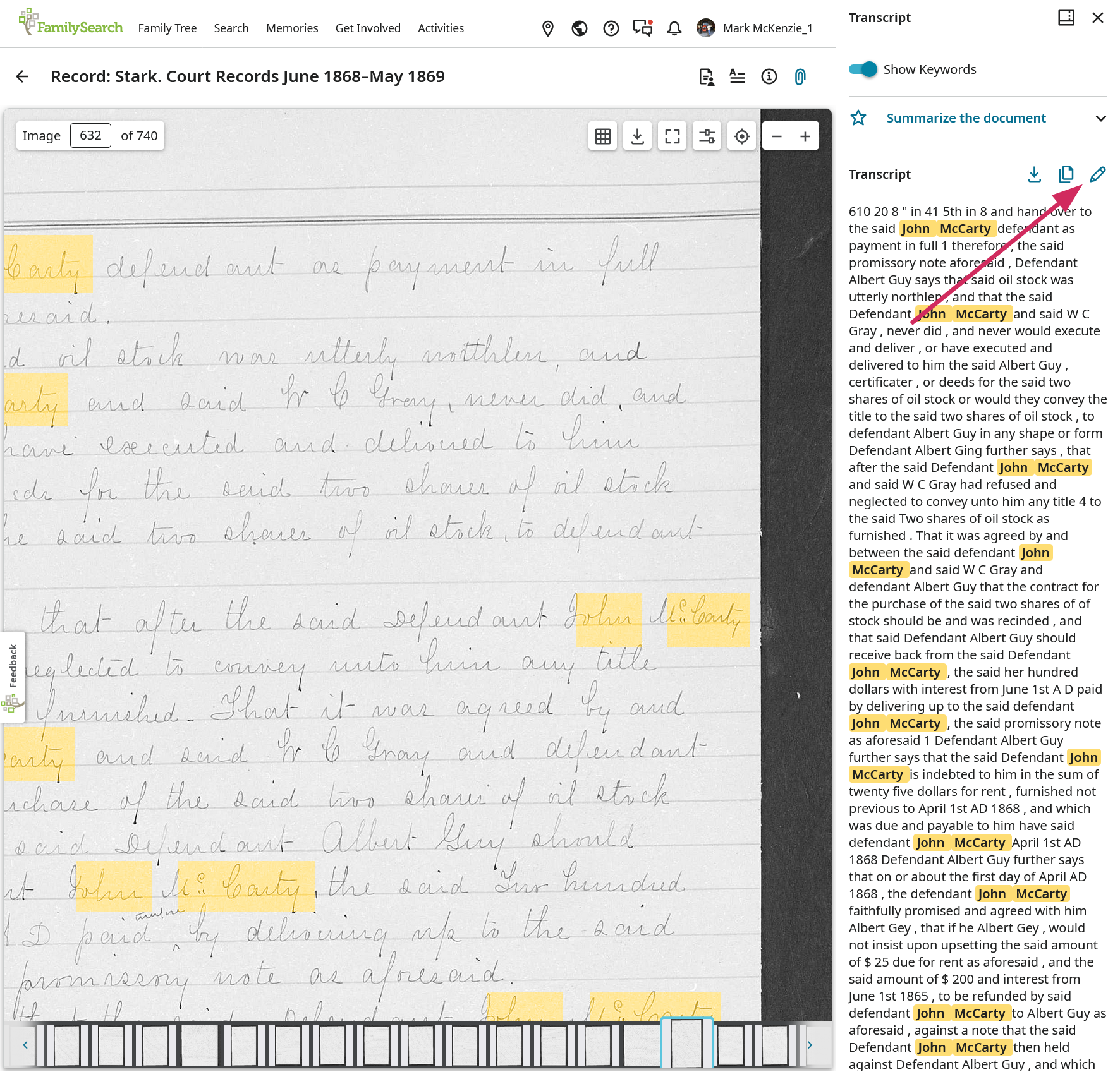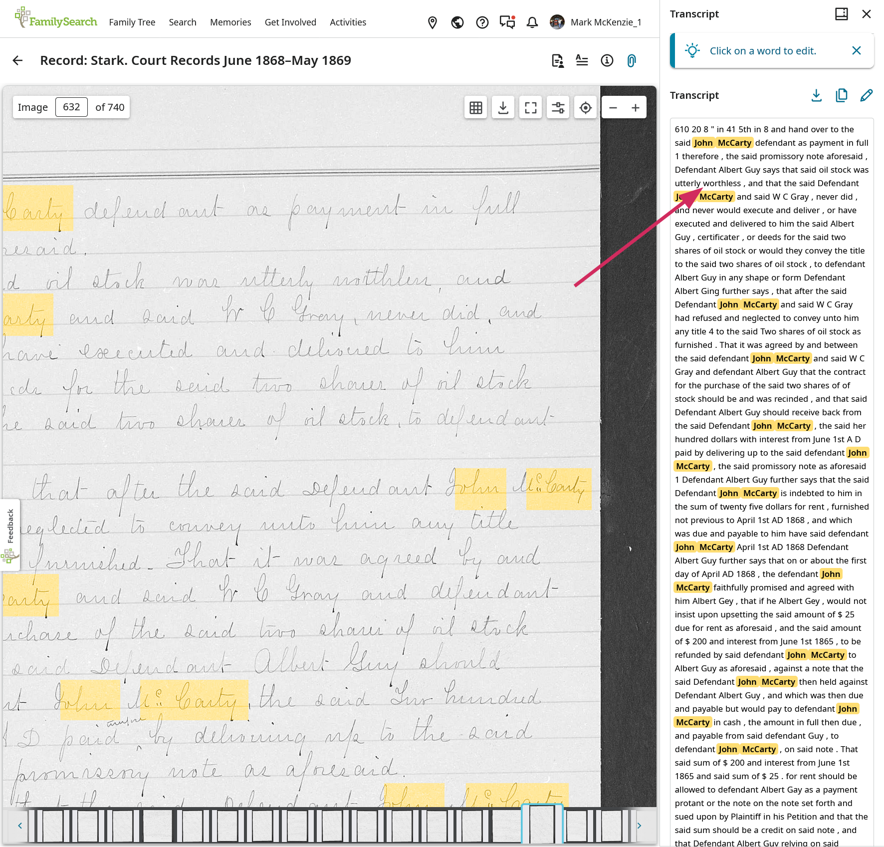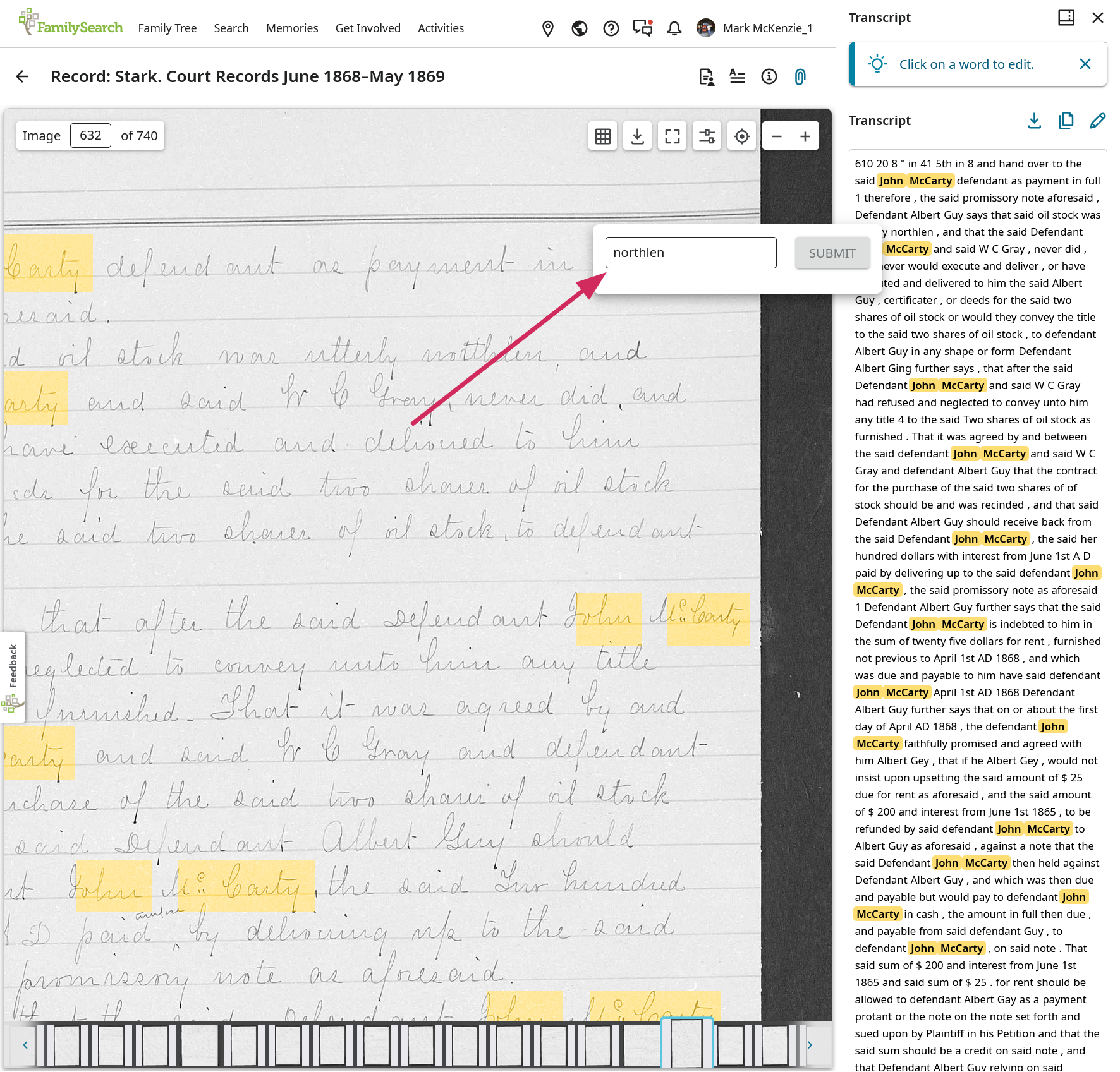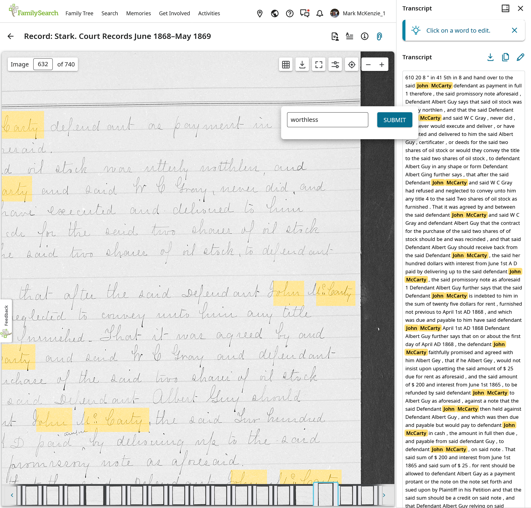 ✭✭✭July 29edited November 14184.105.1.6In looking over FTS result today I find a feature to edit the transcriptUpon selecting text in the Transcript you can edit as desiredIf I copy the modified text to the clip board the change is reflected. Upon performing subsequent FTS the modified text also appears to be saved.I am curious if my edit will be seen by anyone else. ThisFTS queryshould get you to the image.I think changes made this way will impact not only the displayed transcription but will also change what results you get using the old vs new wording as a keyword phrase… e.g. +"utterly northlen" will no longer generate any results. Probably not just for me but for anyone….I've got mixed feelings on this… On one hand this seems like a good idea to get a human addressing 'perceived' errors in transcription and potentially improving search results. But then again, if I changed the text to read something totally wrong, it would cause FTS results to be badly impacted. Kind of like Family Tree 'merges' that are easily facilitated then come to find out it makes a mess of things1 -