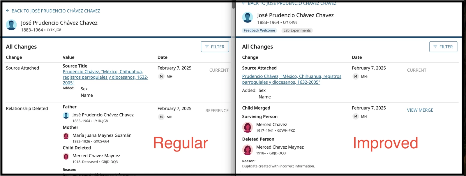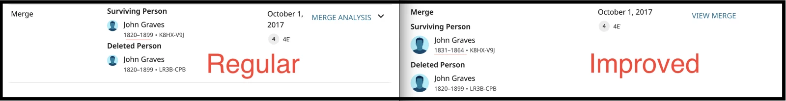- I do NOT like that you can no longer have the option to just expand the merges that are for the person whose profile you are in and see a summary of the changes, instead you have to View Merge and study the merge analysis in a separate page to figure out for yourself what changes were made.