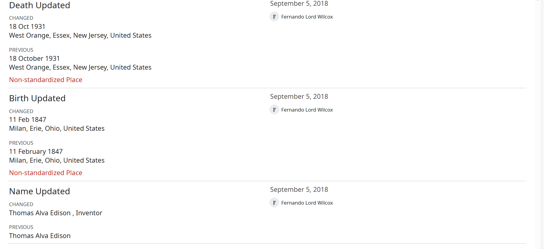 - I DO like that you can now see when children/spouses/parents have been merged with links to view the merge right in the relative's changelog. This is a good change that makes it a lot easier. It would be nice if the reason statements also displayed for those merges. Oh never mind, I see the user "FamilySearch" who made those merges was naughty and didn't include reason statements for their merges, not even the auto-generated ones, in the Thomas Alva Edison example.