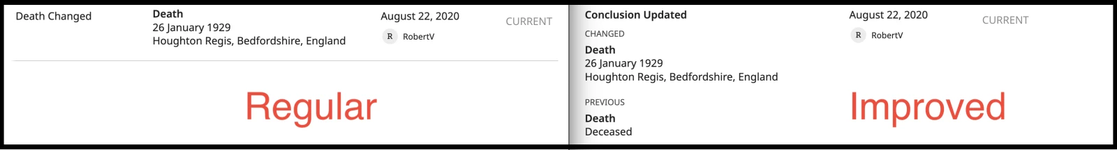 - I'm really happy that all that "conclusion" nonsense from an earlier version of the new changelog has already been changed to real words (i.e. instead of "conclusion updated" for every item, it now shows similar to how it reads in the regular changelog like "death updated" and "alternate name added")