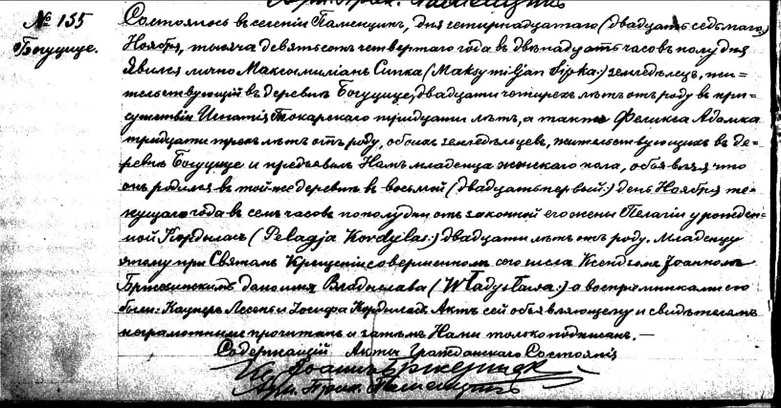 Birth Record No. 135, Pamięcin Parish, Kalisz, Wielkopolska, Poland, of Władysława Sipka, born in Bogucice on 21st November 1904, at 7 pm, christened on 27th November 1904, at 12:00 noon, daughter of Maksymilian Sipka, a farmer living in village Bogucice, 24 years old, and of his wife, Pelagia, born Kordylas, 20 years old. Witnesses: Ignacy Tokarski, 30 years old, and Feliks Adamek, 33 years old, both farmers living in Bogucice. Godparents: Kacper Lesień and Józefa Kordylas.