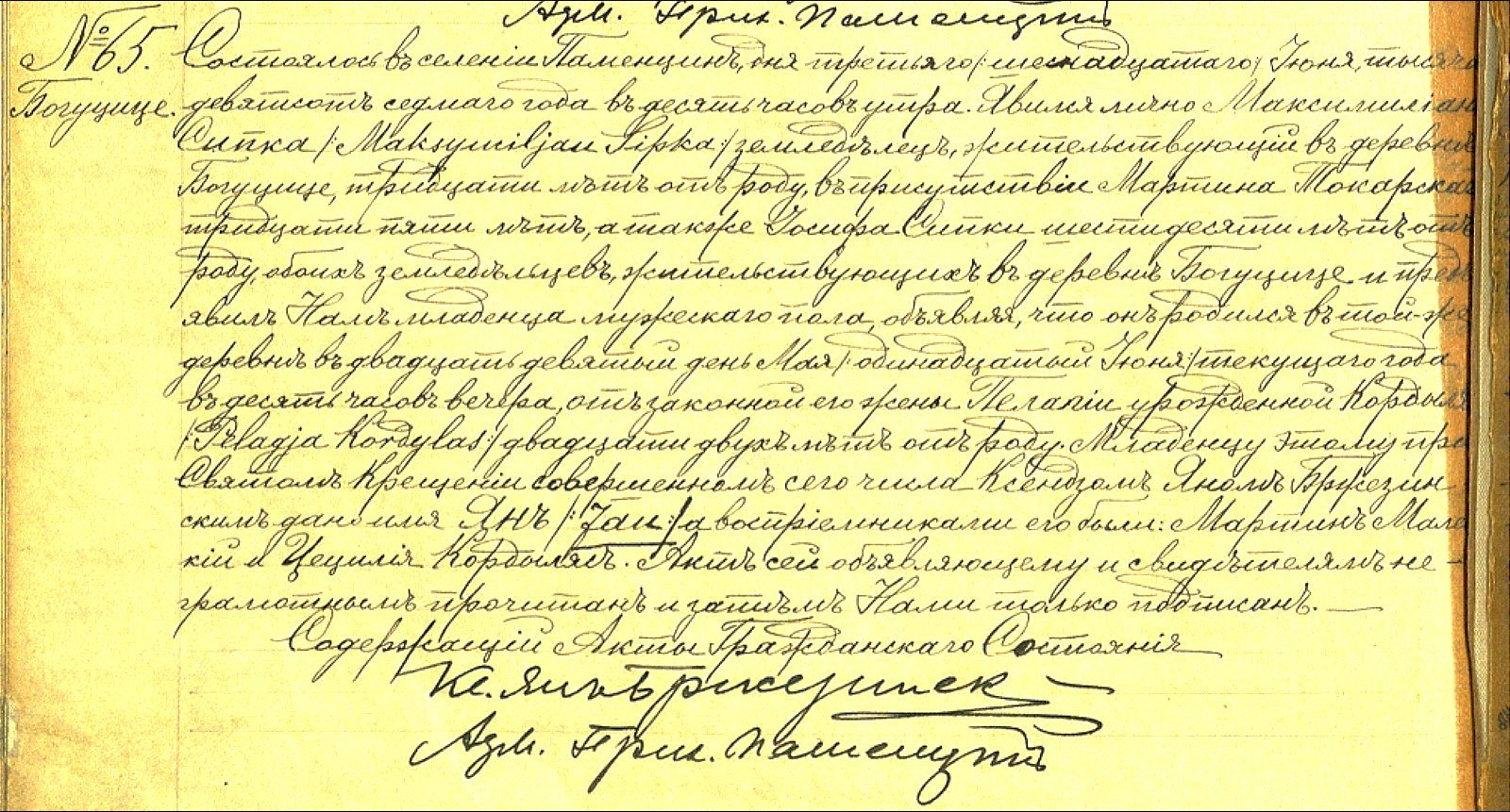 Birth Record No. 65, Pamięcin Parish, Kalisz, Wielkopolska, Poland, of Jan Sipka, born in Bogucice on 11th June 1907, at 10 pm, christened on 16th June 1907, at 10 am, son of Maksymilian Sipka, a farmer living in village Bogucice, 30 years old, and of his wife, Pelagia, born Kordylas, 22 years old. Witnesses: Marcin Tokarski, 35 years old, and Jozef Sipka, 60 years old, both farmers living in village Bogucice. Godparents: Marcin Malecki and Cecylia Kordylas.