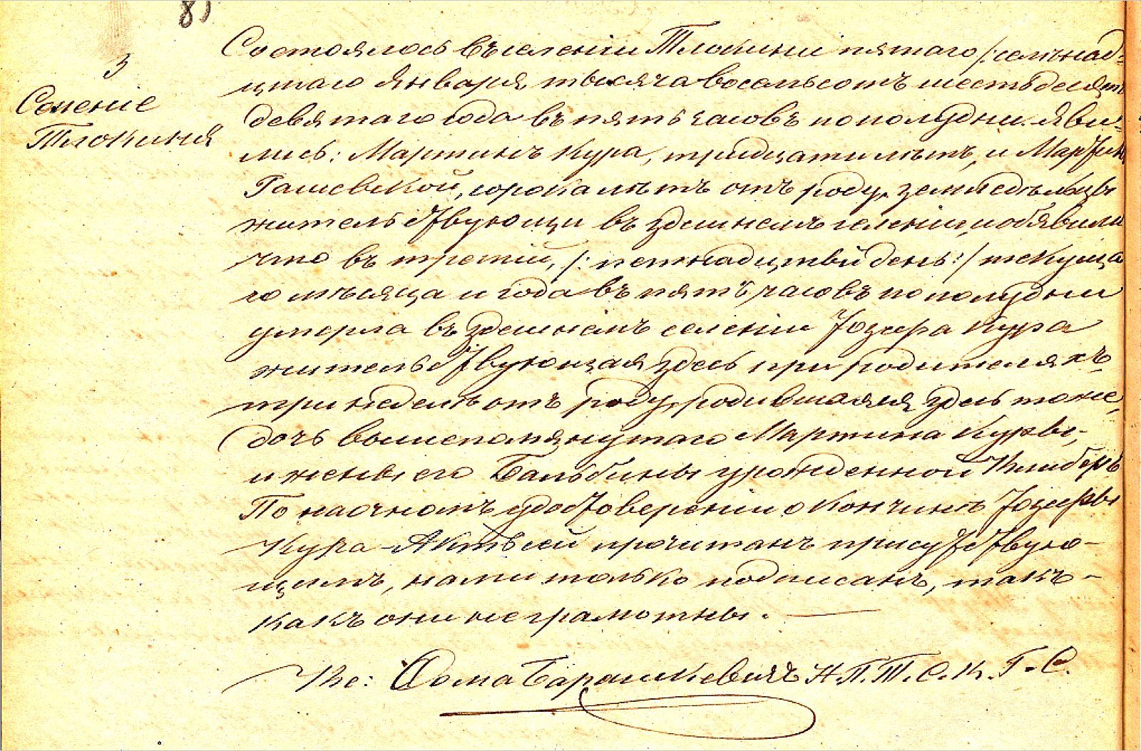 Death Record No. 3, Tłokinia Parish, Kalisz, Wielkopolska, Poland, of Józefa Kura, who died in Tłokinia on 15th January 1869, at 5 pm, death reported on 17th January 1869 at 5 pm, she lived three weeks, she was born and lived with her parents in Tłokinia, she was daughter of Marcin Kura and of his wife, Balbina, born Kliber. Death reported by Marcin Kura 30 years old, and Marcin Gaszewski, 40 years old, farmers from Tłokinia. After confirming with my own eyes the death of Józefa Kura, this record was read and signed.