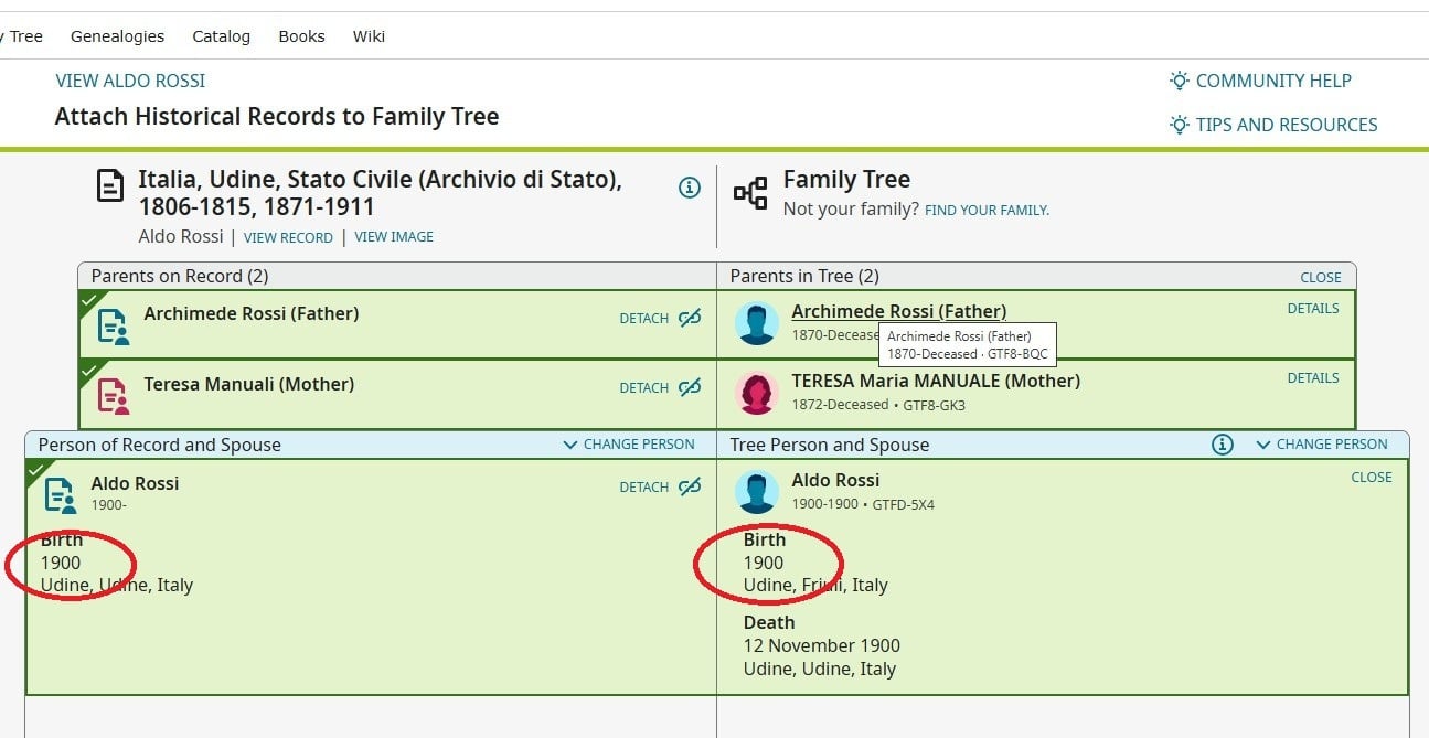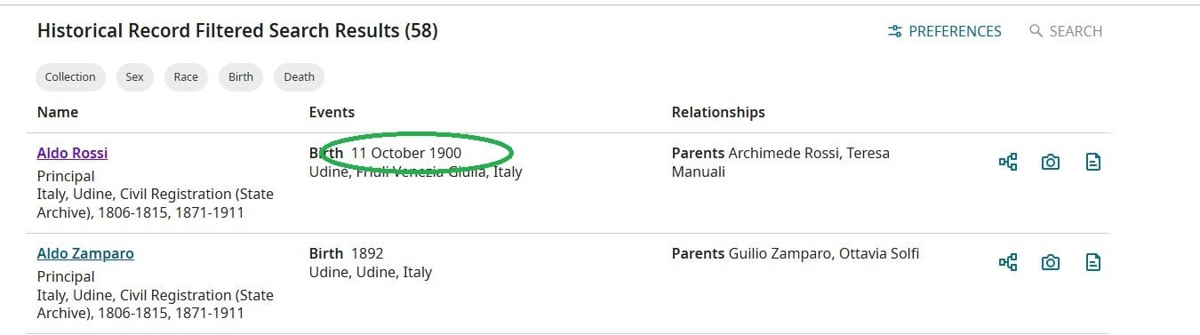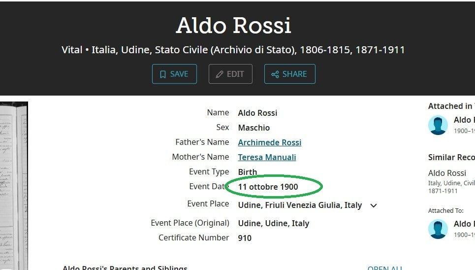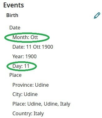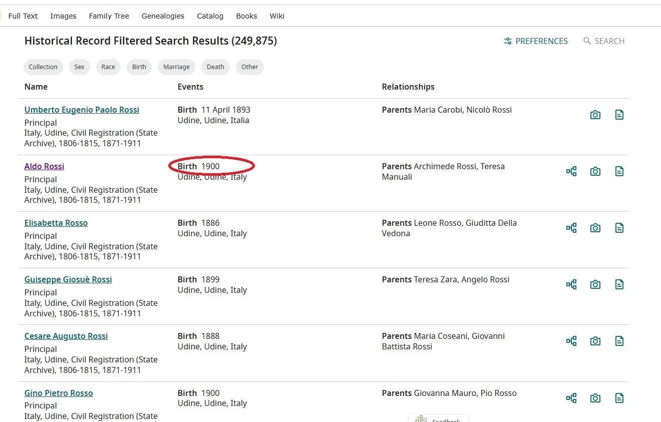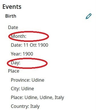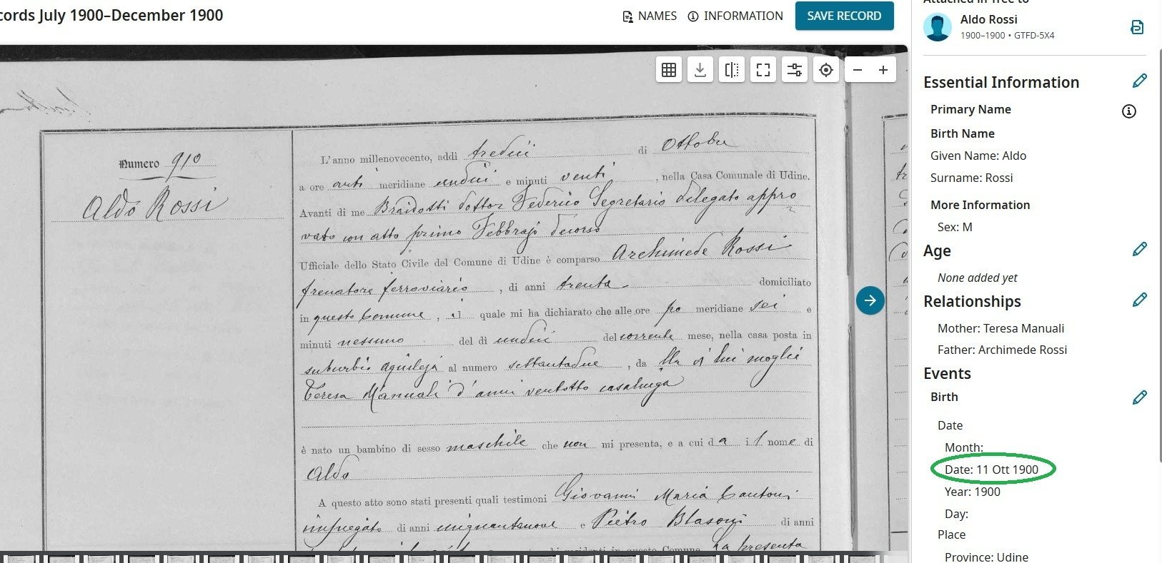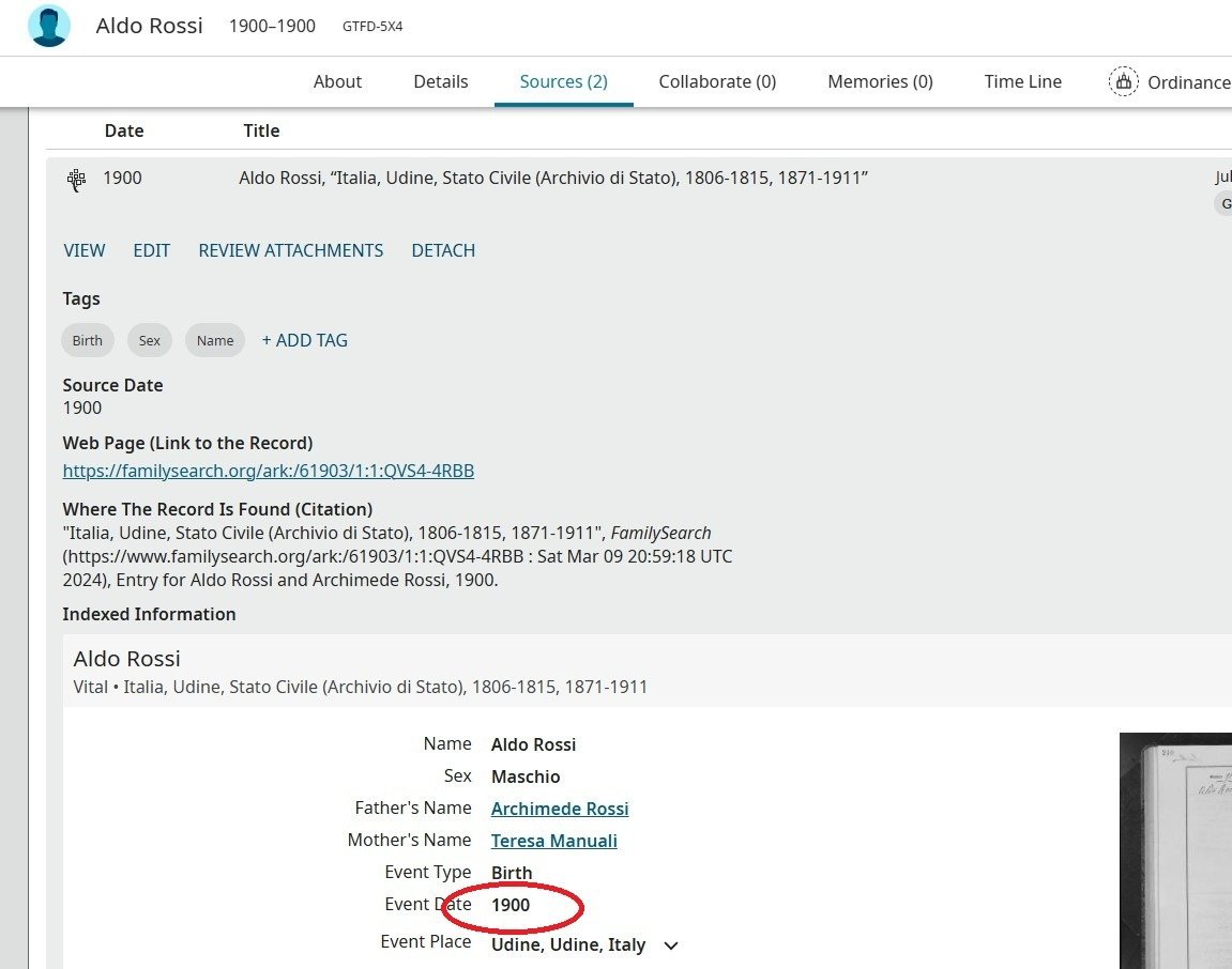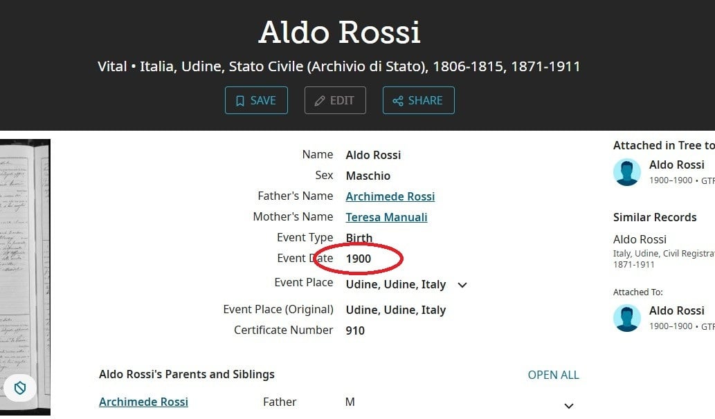 Most birth records from 1875-1900 in the Italian province of Udine show only the birth year in the record, despite the fact that the full birthdate was indexed. This was initially functioning correctly, but sometime between October 2022 and April 2024 this problem appeared. Because of this, in Source Linker, when creating the child referred to in the birth record, only the birth year is added (unless the patron notices and goes through extra steps to find and apply the full date).. And now, it’s harder for machines and humans to disambiguate between two people with similar names who were born in the same year, contributing to the problem of profile and family “mangling”.