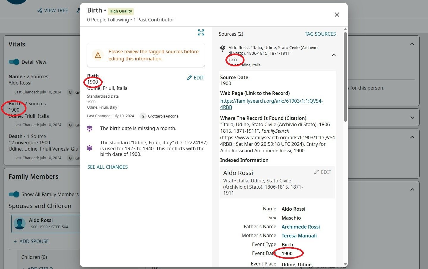 As a result of these profiles with year-only birth dates, and exacerbated by the fact that so many people share the same names, it appears that many more incorrect hints are being accepted since there is less data to help disambiguate between two people (Giuseppe Rossi born 17 Feb 1896 and Giuseppe Rossi born 23 Jul 1896 may look to a patron and to a computer as if it’s a single Giuseppe Rossi born in 1896). So profiles and families end up getting “mangled” together at a seemingly higher rate than before this problem occurred.