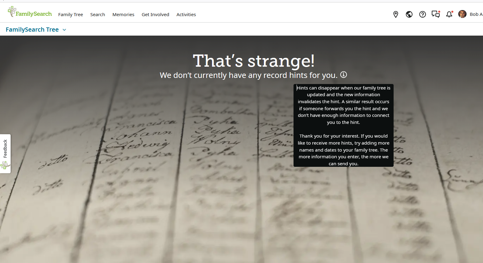 Moments ago, I followed the WEEKLY bogus notification link to a Record Hint. This time I responded immediately, within two minutes of its arrival to my inbox. I did not have a pop up blocker. There was NO CHANGE nor any new information gathered on my Familysearch.org account, nor have I done ANY research activity, or changed any data. Nevertheless, you DRIP bogus notifications about Record Hints that are not present anywhere. Again and again, your notifications NEVER EVER correspond to ANY new information. Why drip?