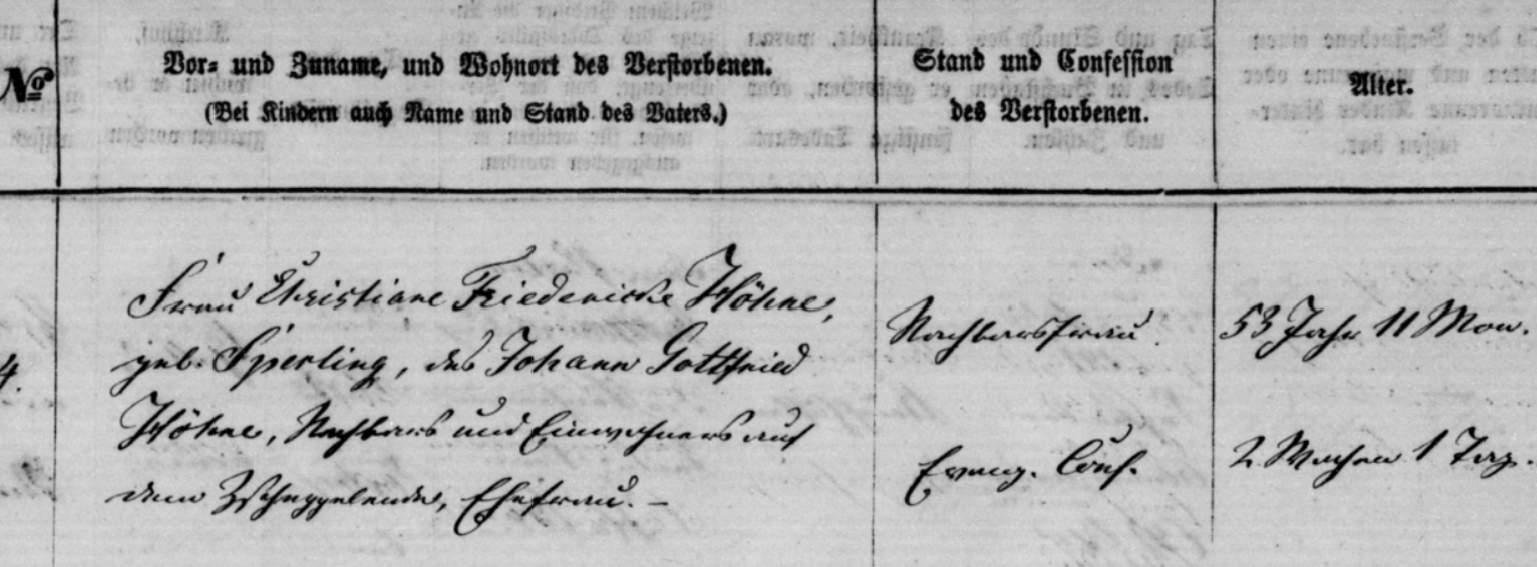 Frau Christiane Friederike Höhne, geb. Sperling, des Johann Gottfried Höhne, Nachbars und Einwohners auf dem Zscheppelande(?), Ehefrau.Stand und Confession des Verstorbenen: