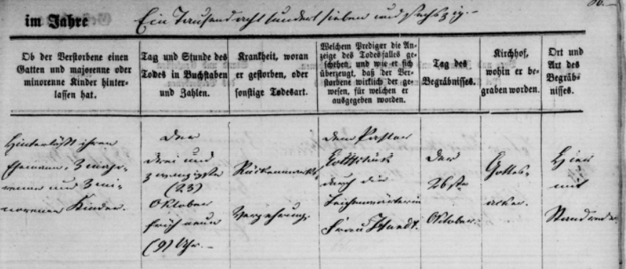 Den drei und zwanzigsten (23) Oktober früh neun (9) Uhr.Krankheit woran er gestorben, oder sonstige Todesart: