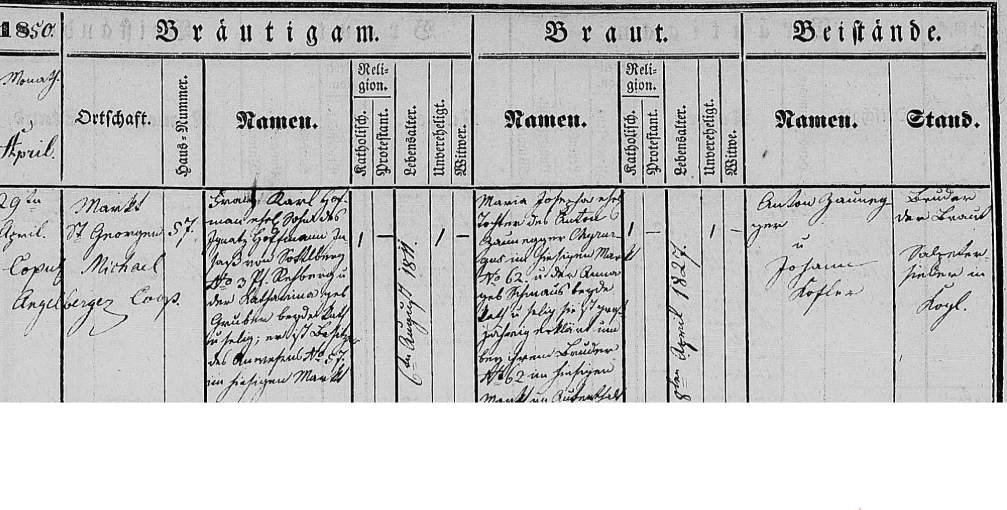 Name of the bride: Maria Josepha, legitimate daughter of Anton Zaunegger, surgeon in the local market town [St. Georgen] no. 62, and Anna, née Schmaus, both Catholic and deceased; she has been declared of legal age and is staying with her brother at no. 62 in the local market town [St. Georgen].