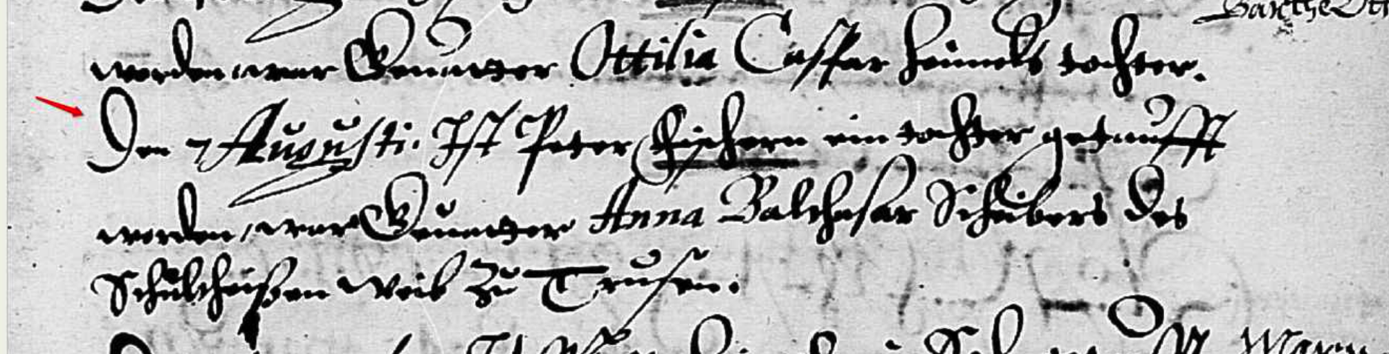 On the 7th of August Peter Fischer had a daughter baptized; the baptismal sponsor was Anna, wife of the mayor Balthasar Scheiber? at Trusen.