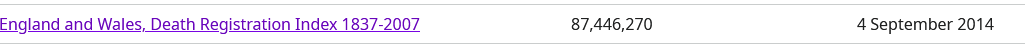 The screenshot suggests there are over 87 million records within the collection - apparently not updated since 2014. I just tried to find anything beyond that date and (for 2015) there appear to be only Burial, Obituary and Funeral collections in FamilySearch. The collection below has come across from Find My Past, so if it has remained "untouched" since 2014 (and the last week or so is my first experience of this problem), it would be most interesting to know the cause.