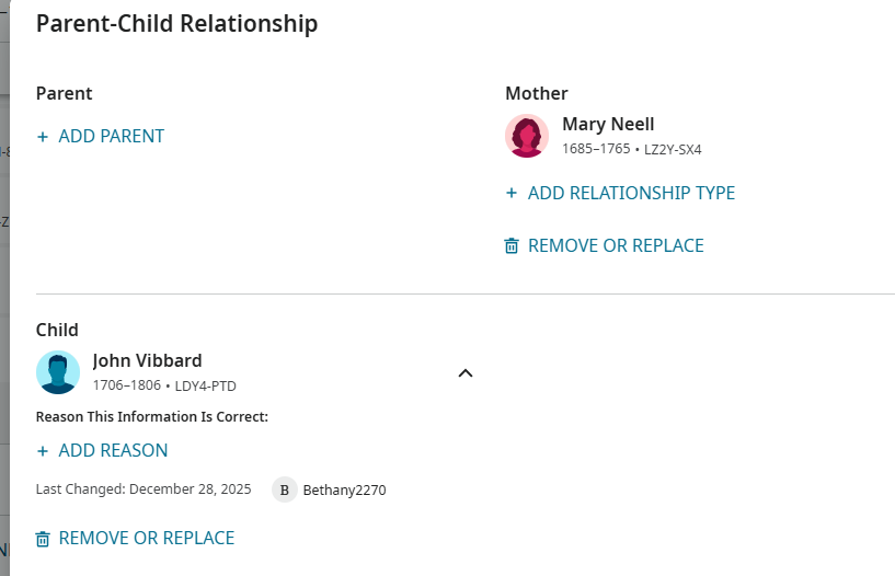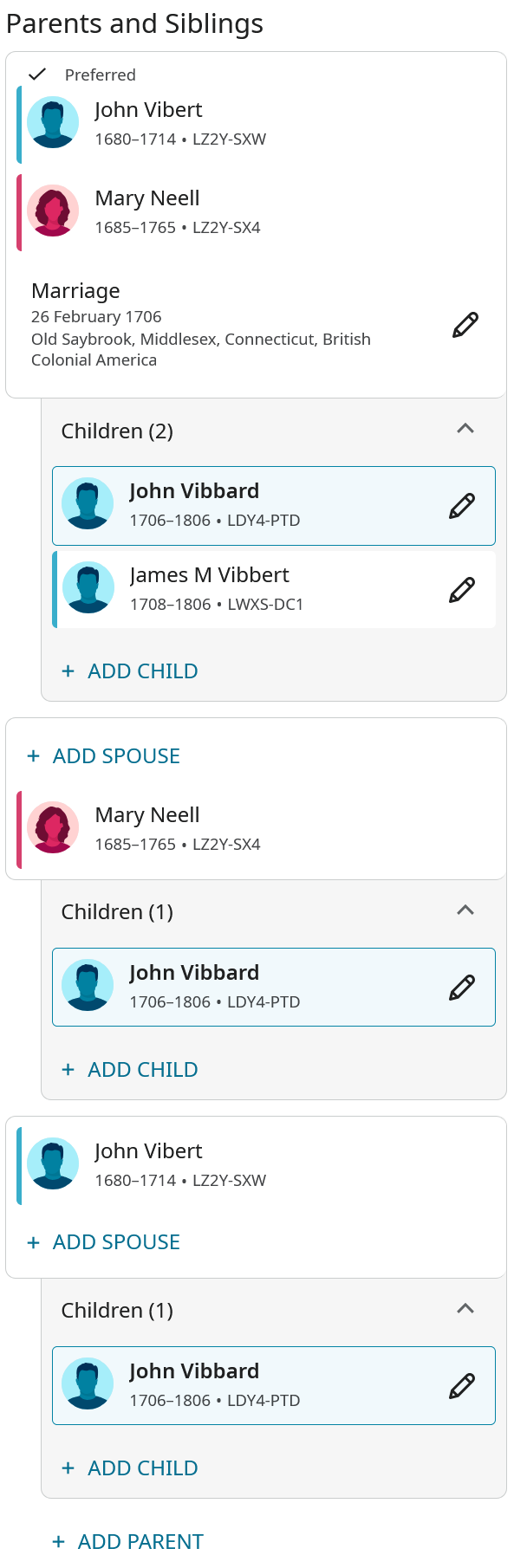 This is What John Vibard's person page looks like it shows multiple sets of parents but they are all the same people. I have tried but I haven't figured out how to correct it. Please help.