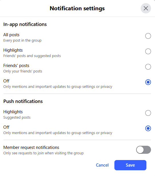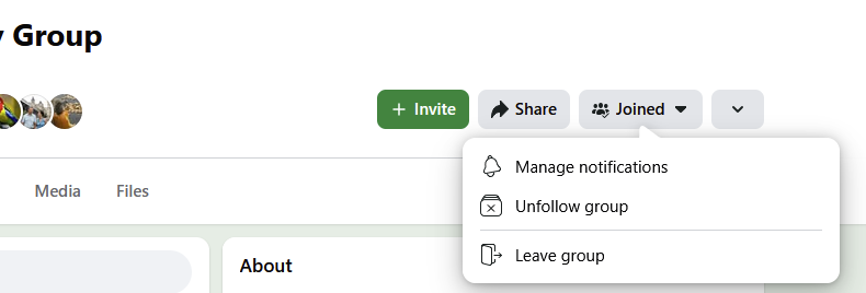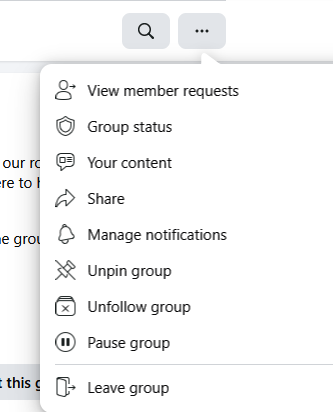 From the home page of the specific group, there is a dropdown menu under the word "Joined." You can manage notifications, unfollow, or leave from that menu: